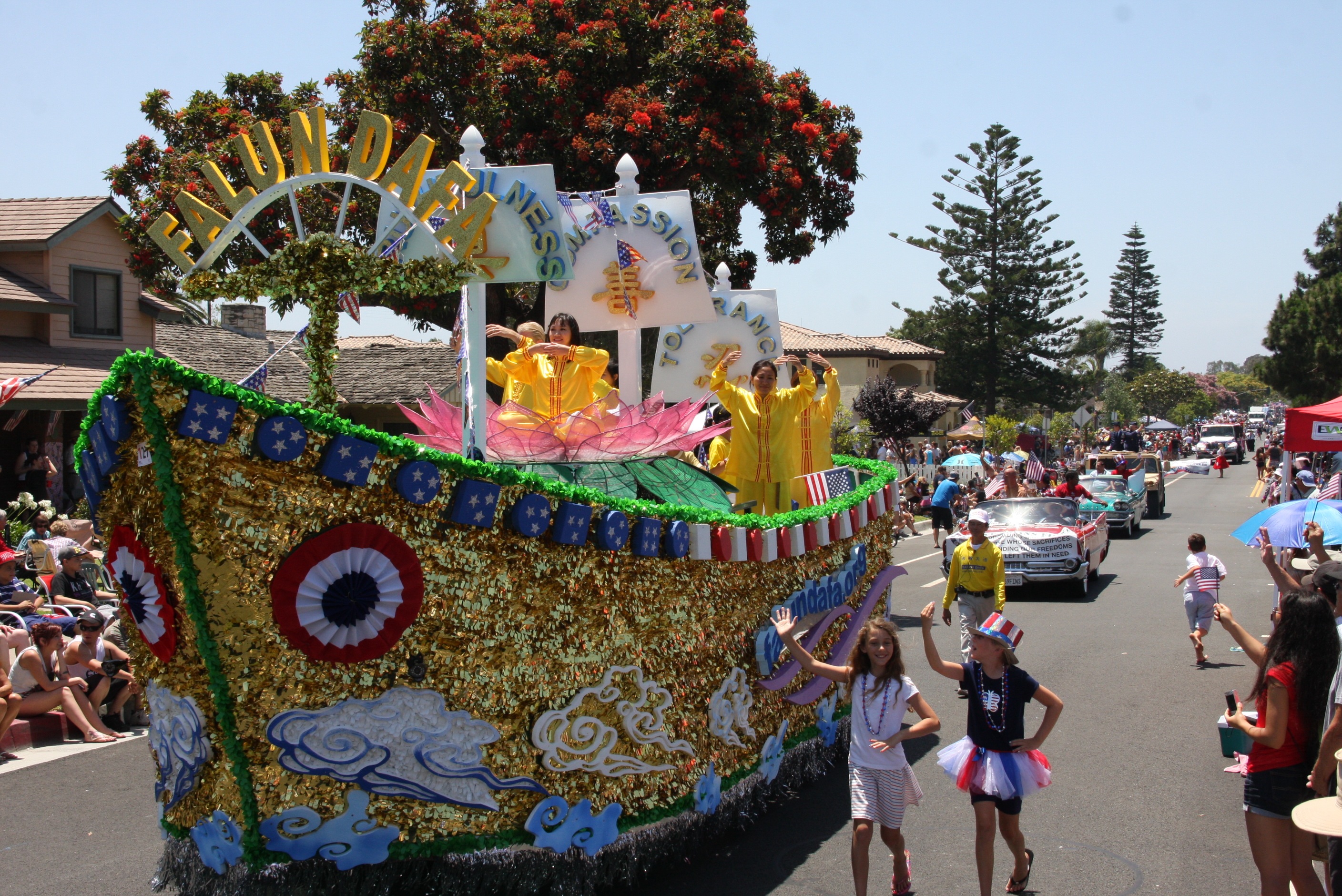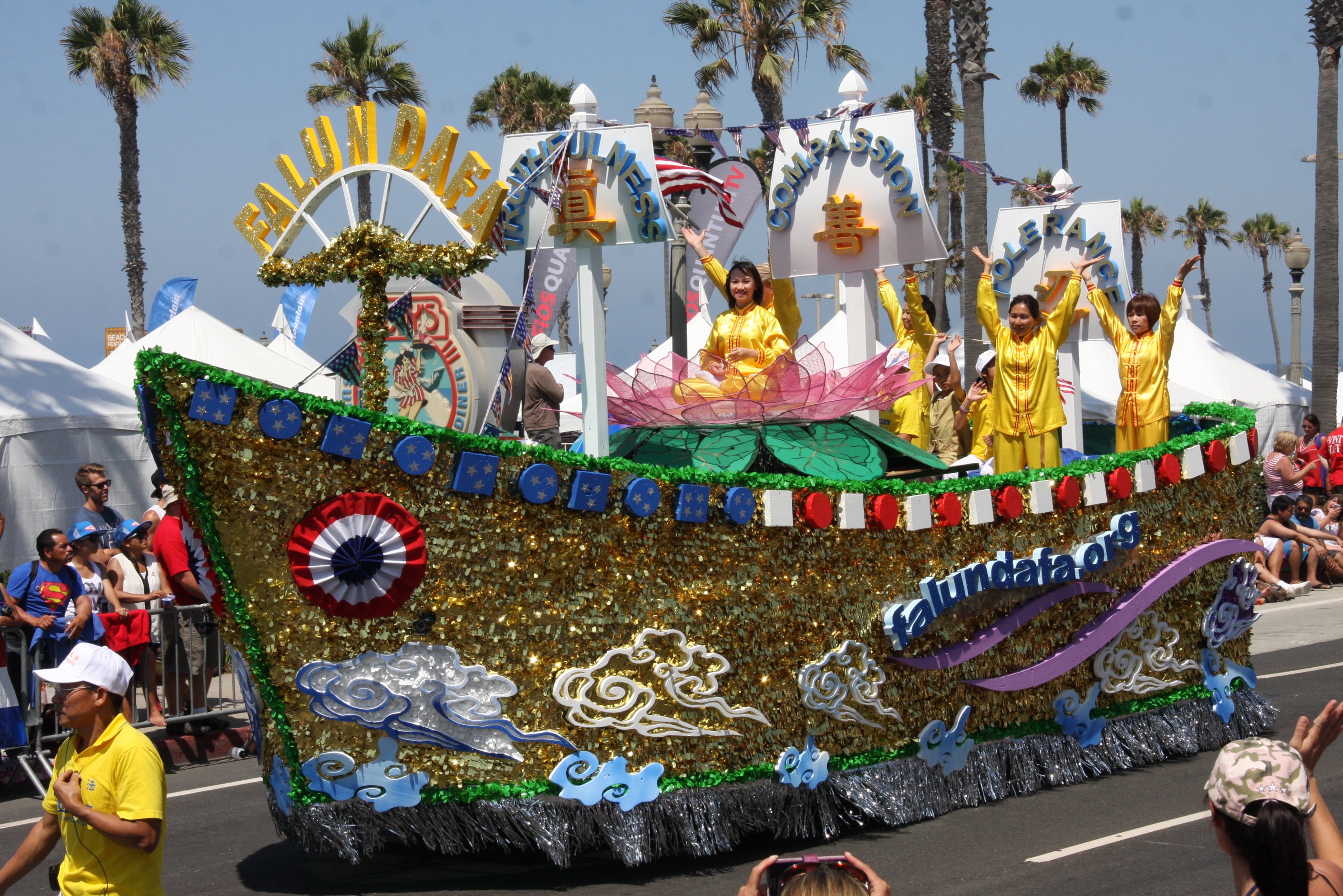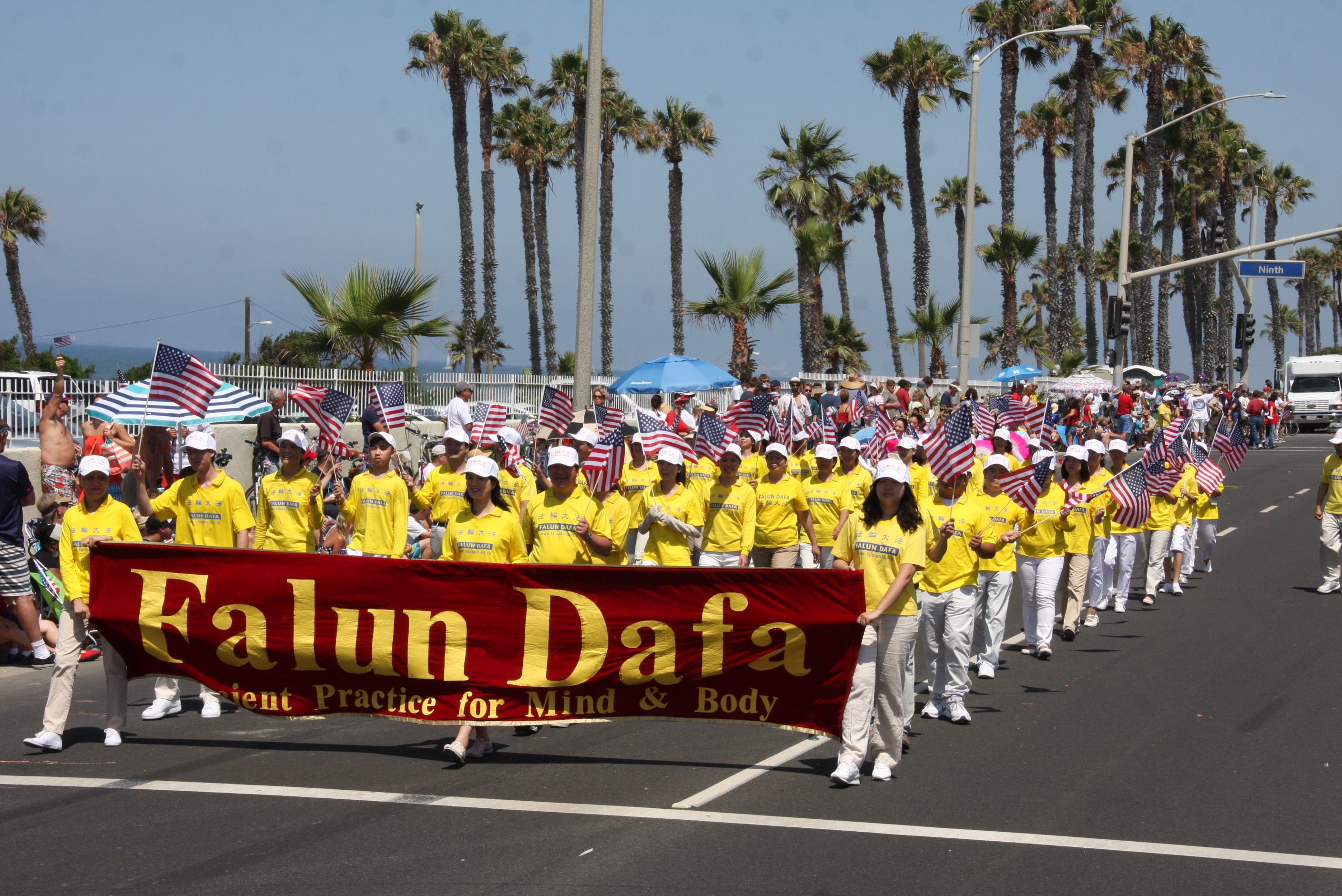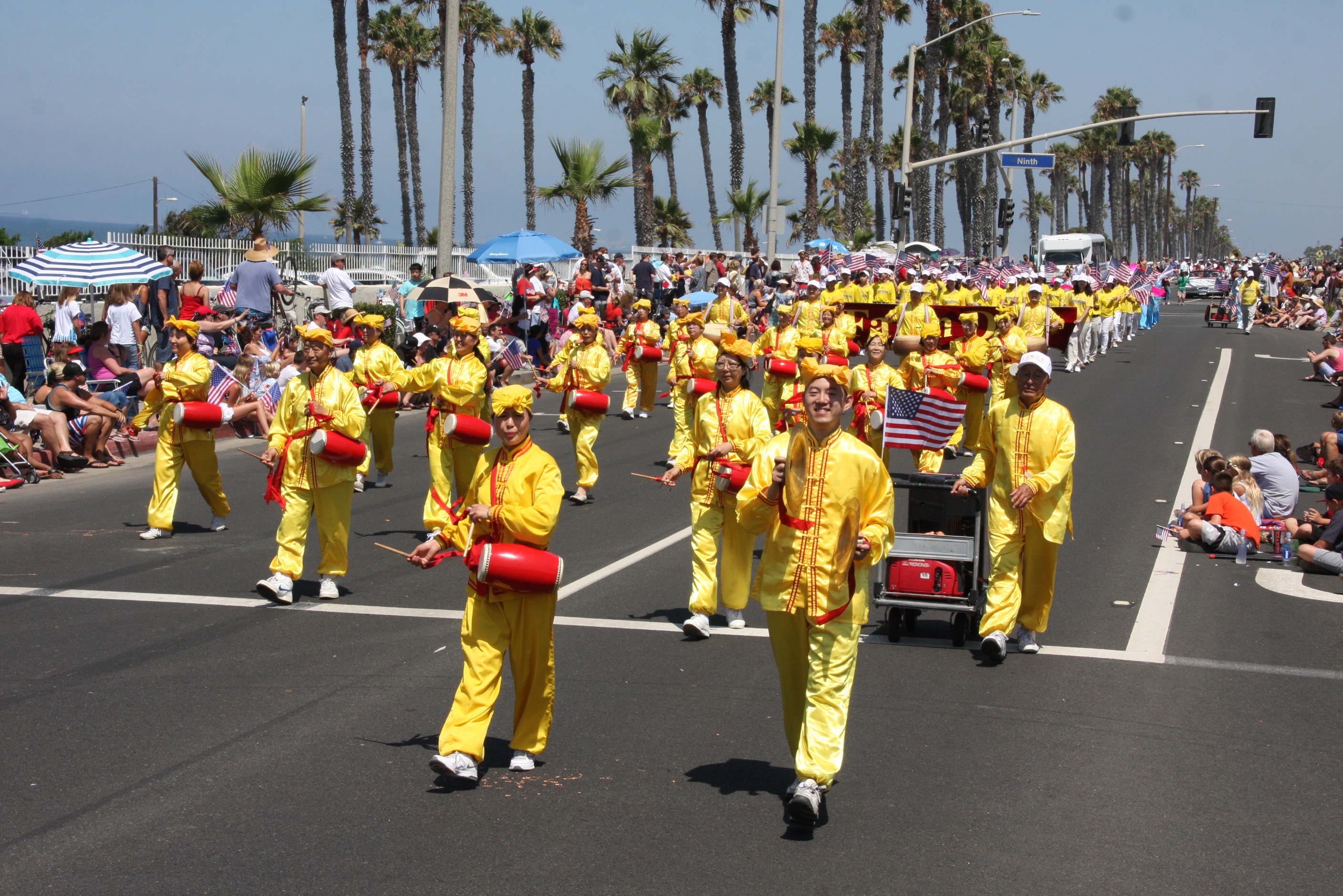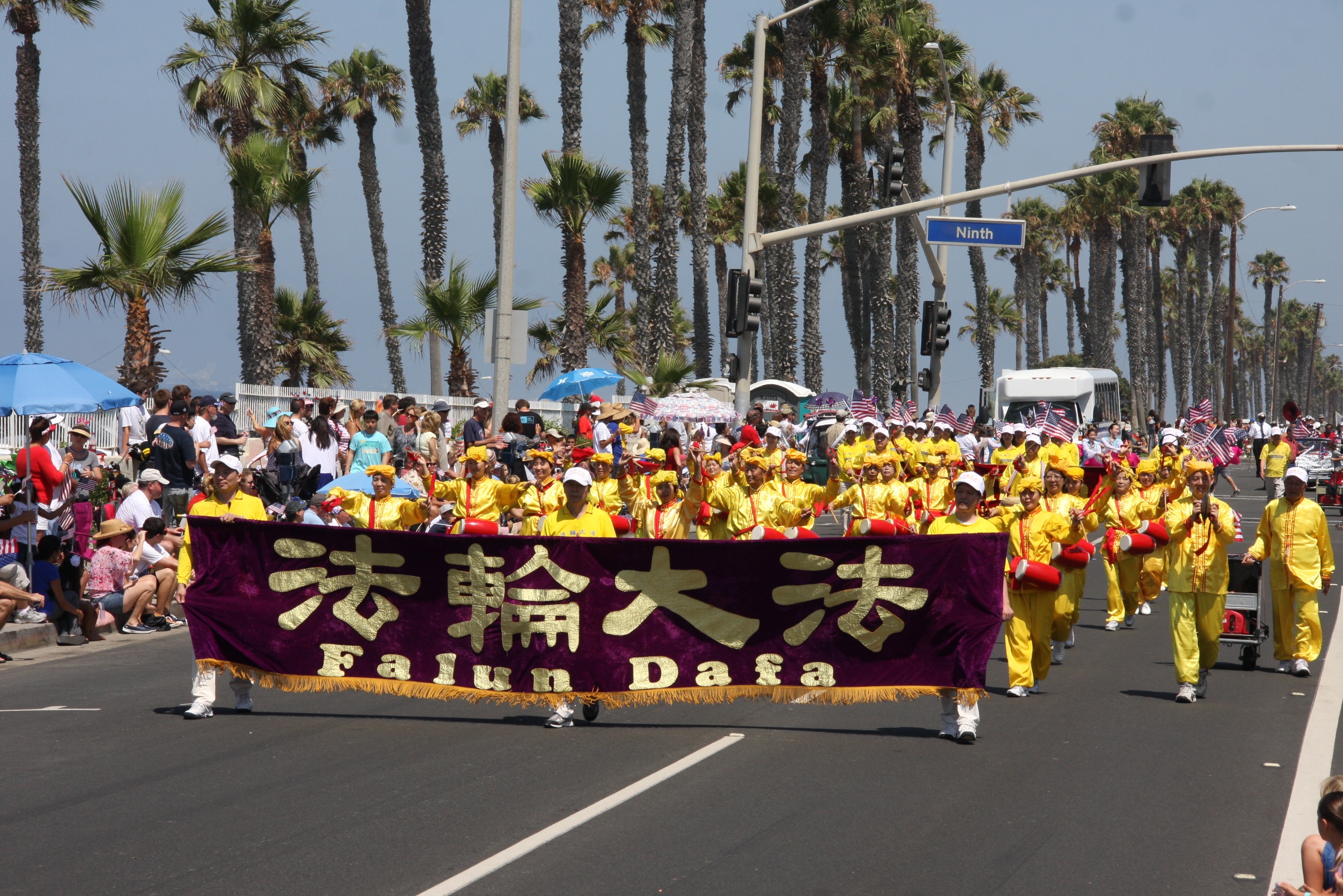 游行中唯一的华人队伍是洛杉矶法轮功学员。今年法轮功学员有超过百人参加杭庭顿海滩市的游行,腰鼓队、旗队、舞蹈队、花车,整个队伍在紫色金字“法轮大法”横幅带领下,祥和盛大又庄严,沿途有近二十位学员发送介绍大法的传单,一张张的将“真善忍”讯息传递到有缘人的手上,有不少民众主动询问有关法轮大法的情形,也有民众宛如见到好友,高兴地说:“去年我们见过你们来参加”。