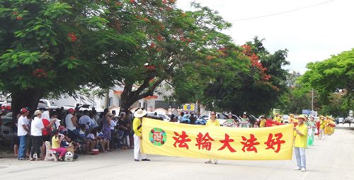 在“世界需要真善忍”的横幅后,精神抖擞并身着金黄色炼功服的腰鼓队,伴随着“法轮大法好”的乐曲,排着整齐的队伍一路击鼓前行,赢得观众的喝彩。最后由两辆鲜花、彩带、气球及“法轮大法好”横幅装饰的花车压轴。观众群中不时传来“法轮大法好”的声音,并有民众在仙女队中拍照留念。