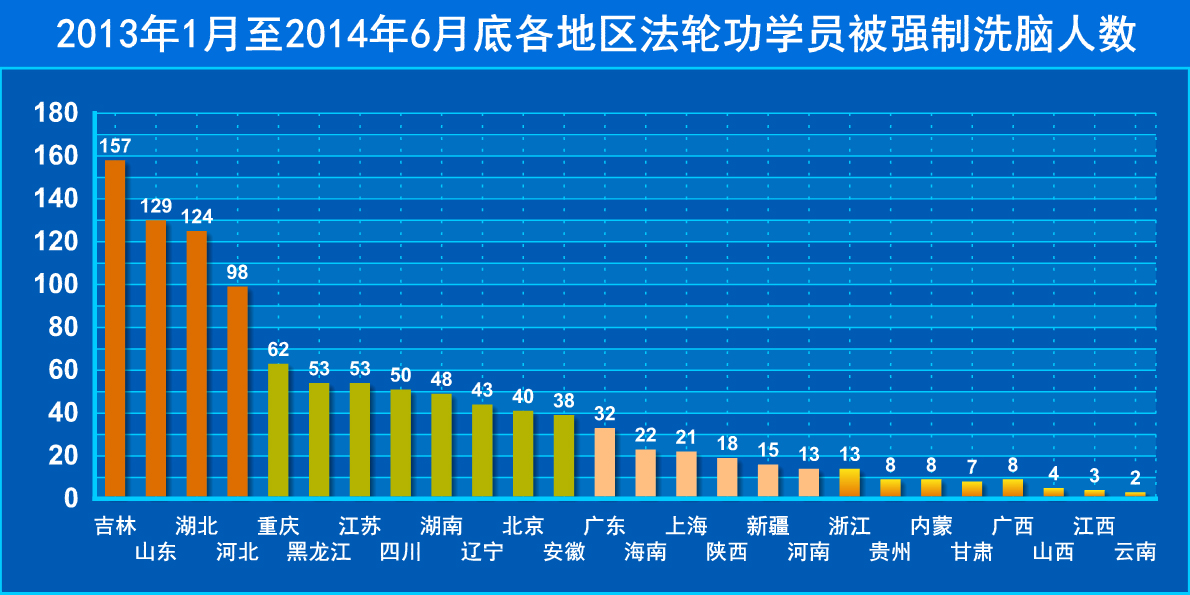 ![]() 图 2013年1月至2014年6月底各地区法轮功学员被强制洗脑人数 |