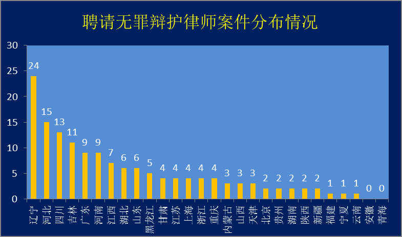 仅在二零一四年上半年(自二零一四年一月一日至六月三十日),明慧网就披露了全国147个迫害法轮功案件约320名被迫害的法轮功学员聘请了约345位律师在法庭上做“修炼法轮功合法”的无罪辩护,比例高达47%,遍布全国26个省直辖市、92个地级市、137个区县,辽宁省最多,其次河北、四川、吉林、广东等地: