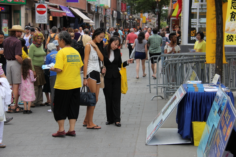 【明慧网二零一四年八月十二日】二零一四年八月九日,蒙特利尔退党服务中心在唐人街举办声援一亿七千万中国人“三退”的集会活动。当天的唐人街游人如织。许多过路游客来到集会的展板前了解真相,当得知中共历史上对中国人民犯下的罄竹难书的罪恶,及当下残酷迫害法轮功的暴行和活体摘取器官“这个星球上从未有过的邪恶”,有数十名中国人现场声明退出中共邪党组织——共产党、共青团和少先队。
