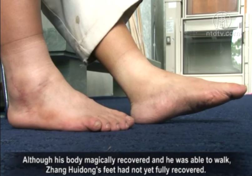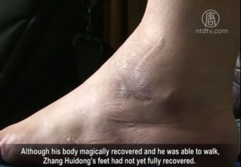 虽然身体神奇般的好转,并能开始行走,但张慧东的双脚功能至今没有完全恢复。张慧东说:“迫害后我这个脚,因为摔伤之后。我的双足的外踝已经被摘掉了。摘掉之后,因为医生不负责任的行为,就是直接给装进去了,导致我骨头现在都是错位的状态。左脚跟骨已经丧失,所以只能靠一个胶皮垫子来垫。尤其在上下坡和上下楼梯的时候,全靠前掌在划,走路就是有这方面的障碍。其他的什么跳跃啊,都跳不起来了。”
