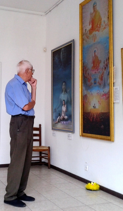 ![]() 航空公司职员阿列克谢(左二)从真善忍国际美展中获得启迪 |