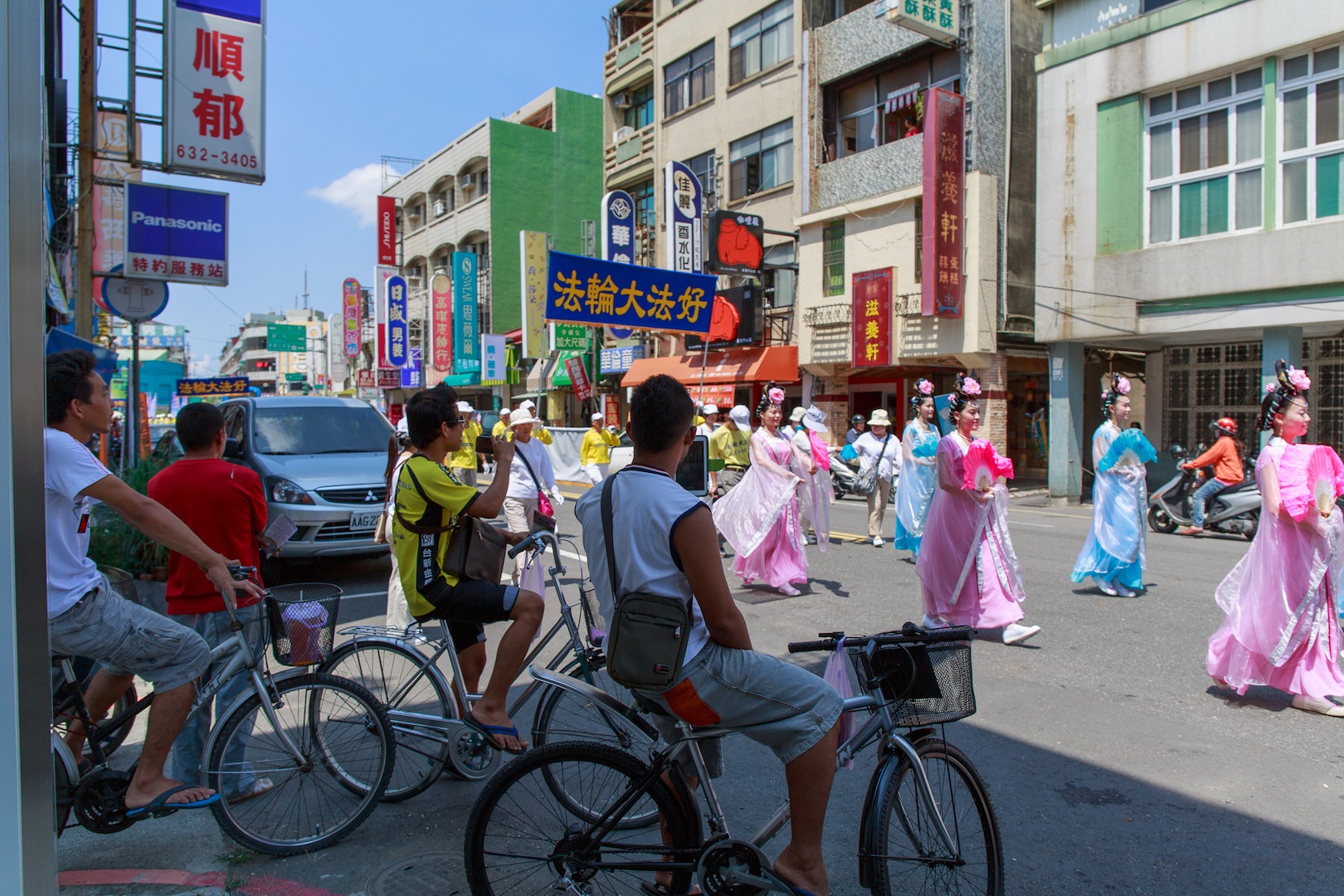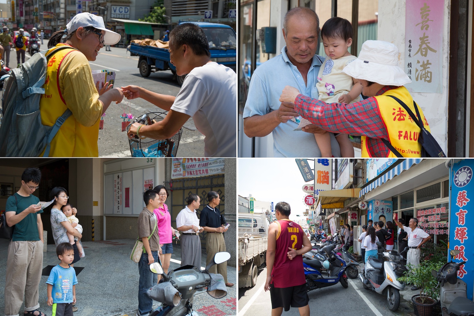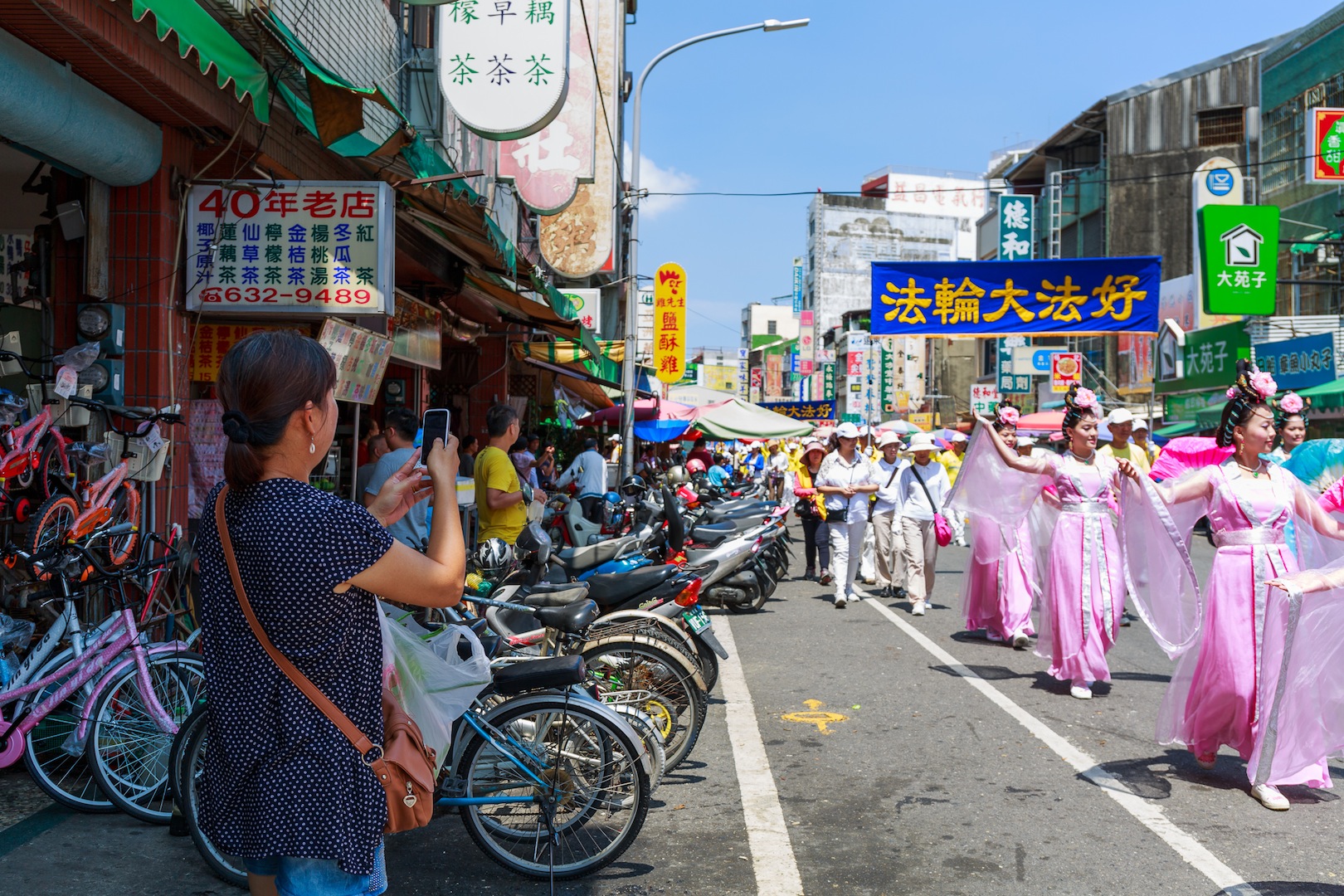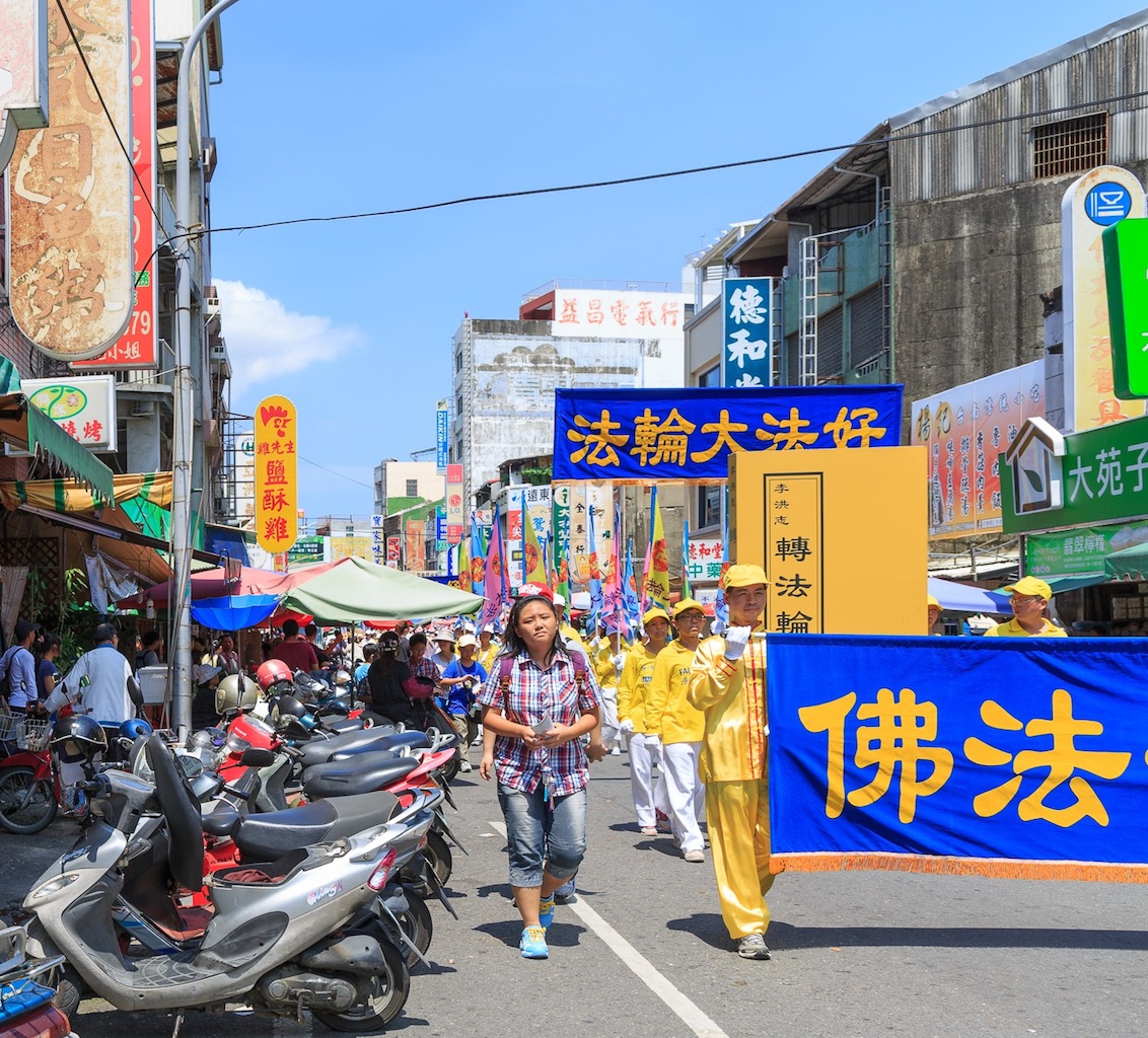 法轮大法洪法队伍走过台南市主要的闹区和乡镇,吸引许多市民和乡亲走出来路旁,翘首迎接。