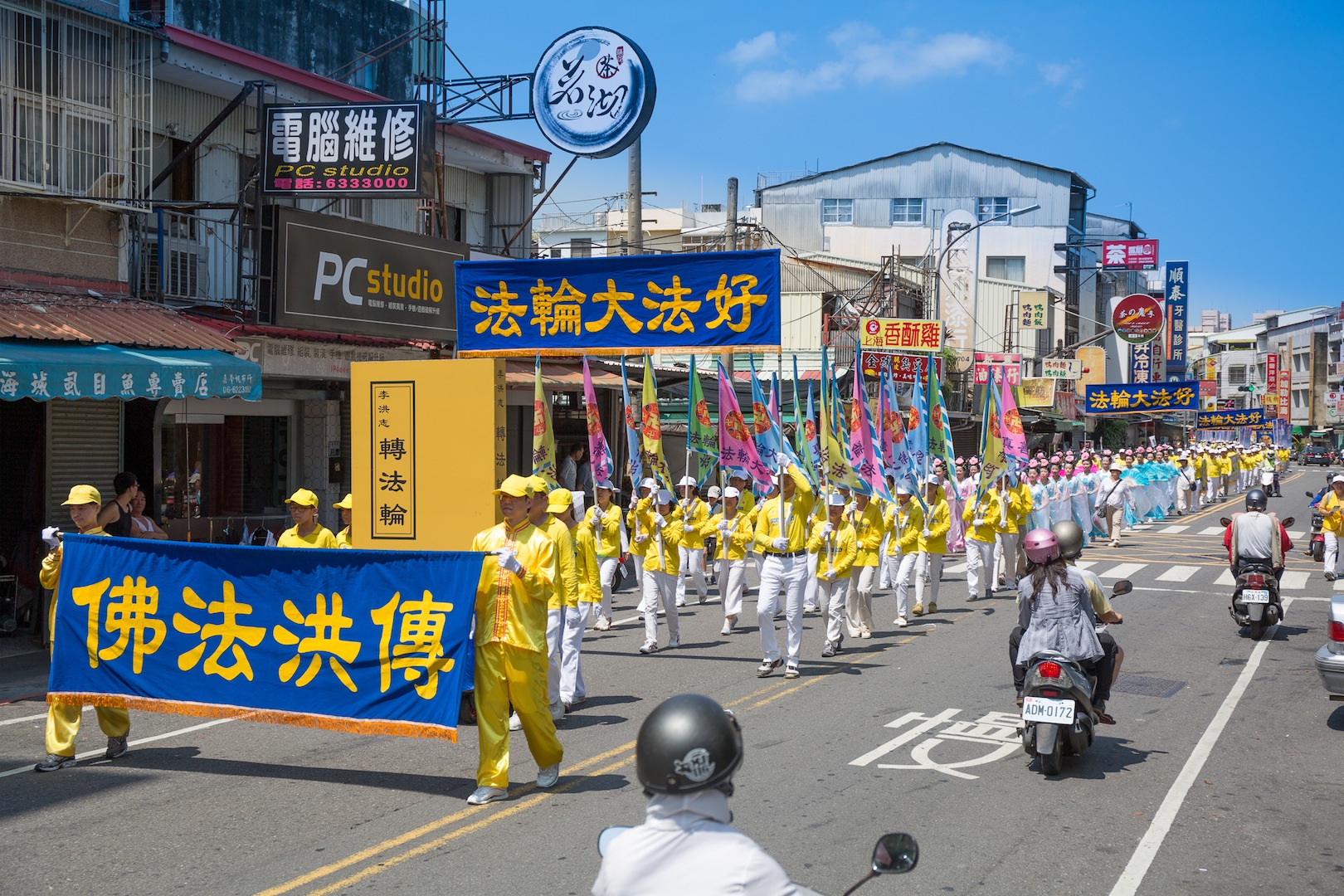 由五百多人组成的法轮大法洪法队伍走过台南市主要的闹区和乡镇,把大法美好带给民众。
