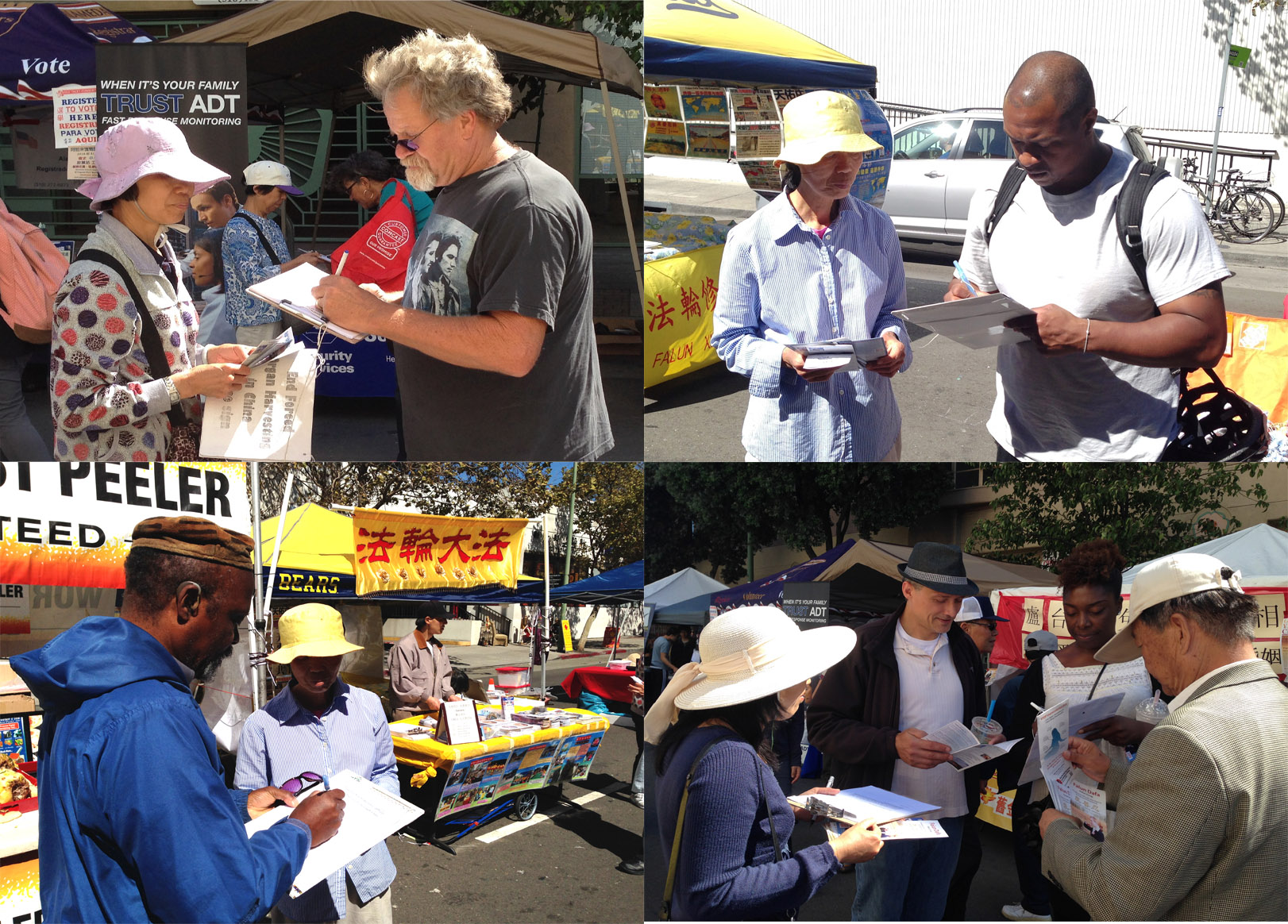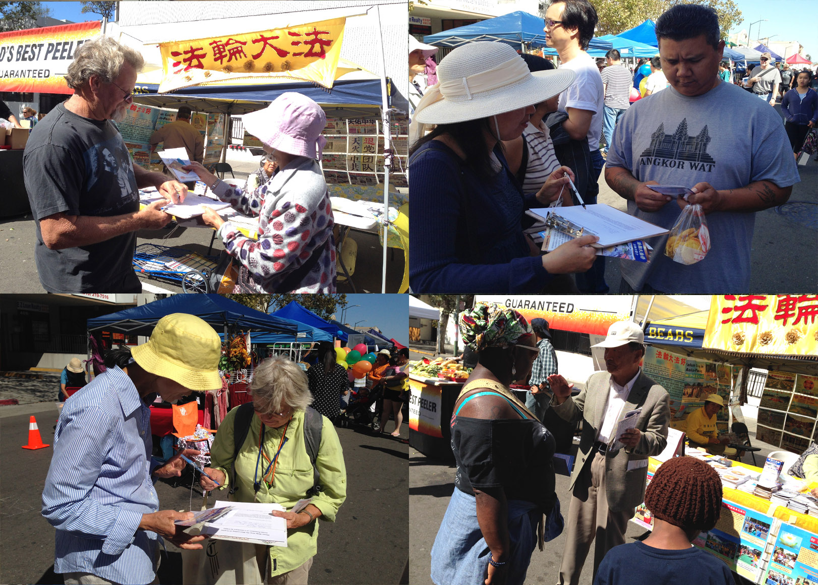 【明慧网二零一四年八月二十五日】(明慧记者李若云奥克兰报道)一年一度的“中秋街会”于二零一四年八月二十三和二十四日两天,在美国旧金山湾区东湾城市——奥克兰(Oakland)唐人街热闹举行。与往年一样,当地的法轮功学员在街会中设立了摊位,告诉各界民众法轮功的美好,揭露中共邪党的罪行,并征集签名反对和制止中共强摘法轮功学员器官的罪恶,同时奉劝中国民众退出邪党及其组织。了解了真相的民众纷纷在征签板上签名,有七十多位中国民众声明三退。