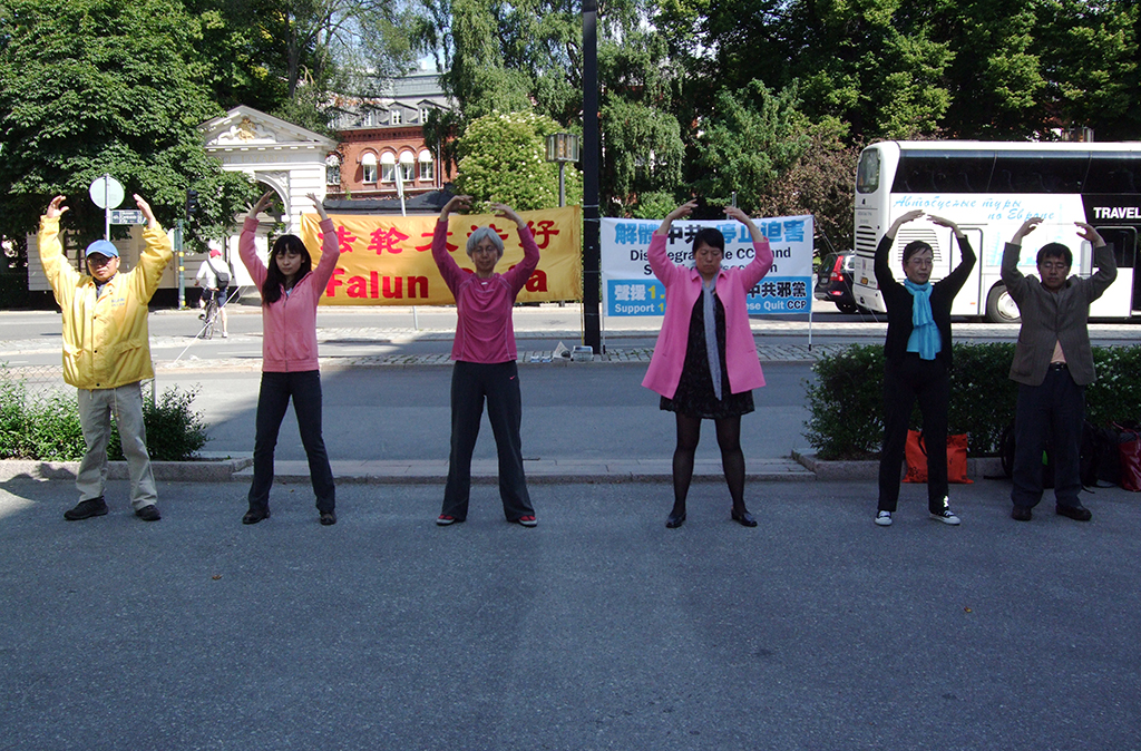 瑞典退党服务中心的义工们自今年六月份以来,每个周末都在斯德哥尔摩市政厅前举办洪法、讲真相劝“三退”活动,让这个著名的旅游景点又出现了一道风景,那就是伴随着法轮功悦耳的炼功音乐的祥和的炼功场面。 法轮功学员在这里向前来旅游的中国人发放真相资料,向人们讲述法轮大法的美好以及中共编造谎言欺骗民众、残酷迫害法轮功的事实真相。帮助那些明白真相的人们退出中共邪党组织——共产党、共青团和少先队(简称“三退”)。