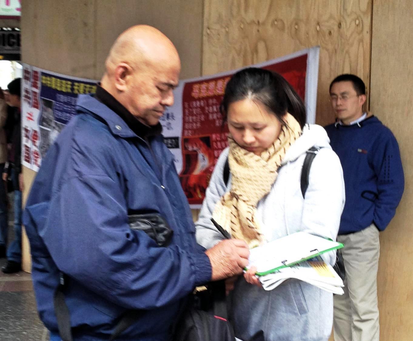 图1:Campsie民众主动签名反迫害,并询问法轮功学员:我能为你们做什么?