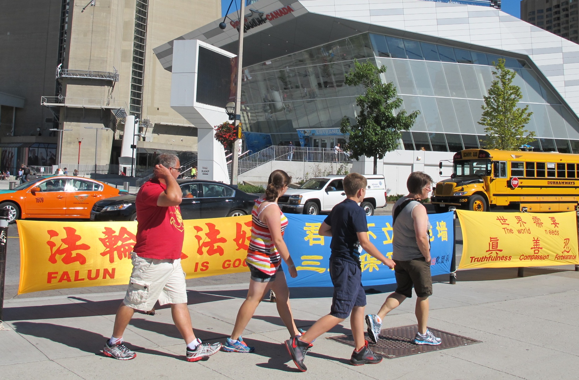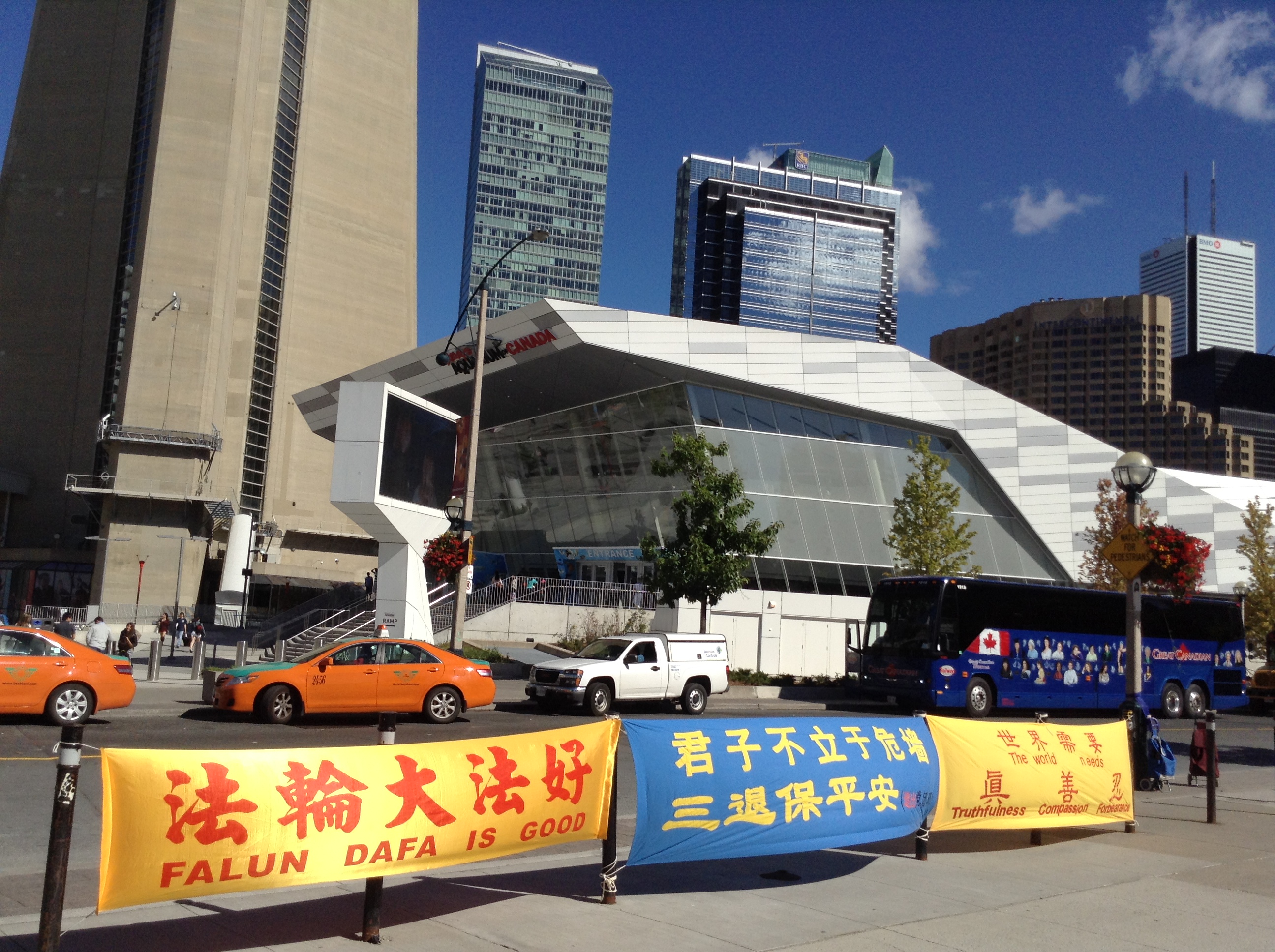 ![]() 来加拿大国家电视塔观光的游客们会看到醒目的法轮功真相横幅 |