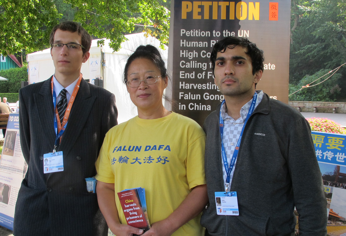 三天中法轮功学员共收到来自世界各国参会代表、市民、游客约一千两百人的签名,还有的代表特意与法轮功学员合影留念,他们说: “我们签名反活摘,我们不怕中国共产党!”