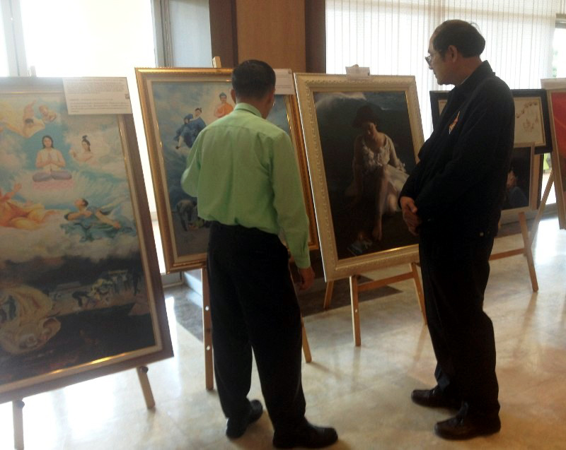 美展时间从九月八日至九月十二日,持续五天,每天上午八点开始到下午四点结束。美展作品陈列于Rajamangala科技大学国王八十寿辰纪念楼三楼,敞亮的大厅里,摆放着鲜花及法轮功学员製作的莲花等,共展出作品近四十幅。开幕当天,科技大学副校长Sukij教授,来到现场,在法轮功学员的陪同下,Sukij教授观看了画展作品及法轮功学员的功法演示后,表达了对法轮功学员的美好祝愿,并预祝美展圆满成功。