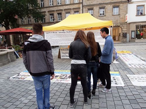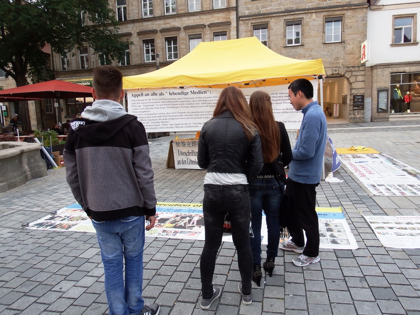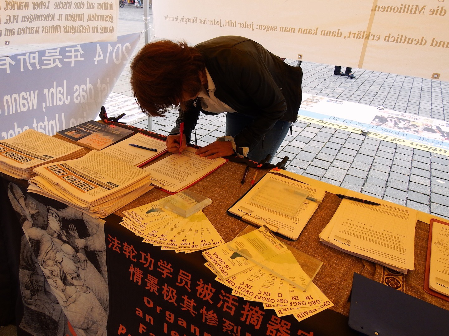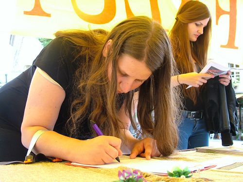 扩音器里不断播放着美国追查国际的调查报告,各界政要名人和国际医生反强摘组织的呼吁,特别是辽宁武警的证人证词录音,使很多人停下脚步屏息静听,凝神关注。