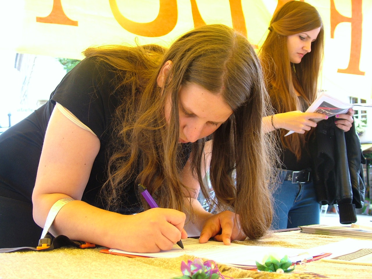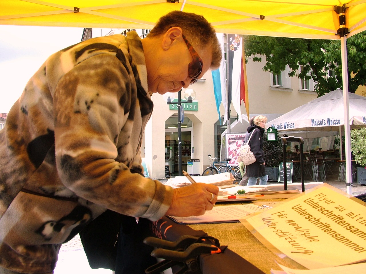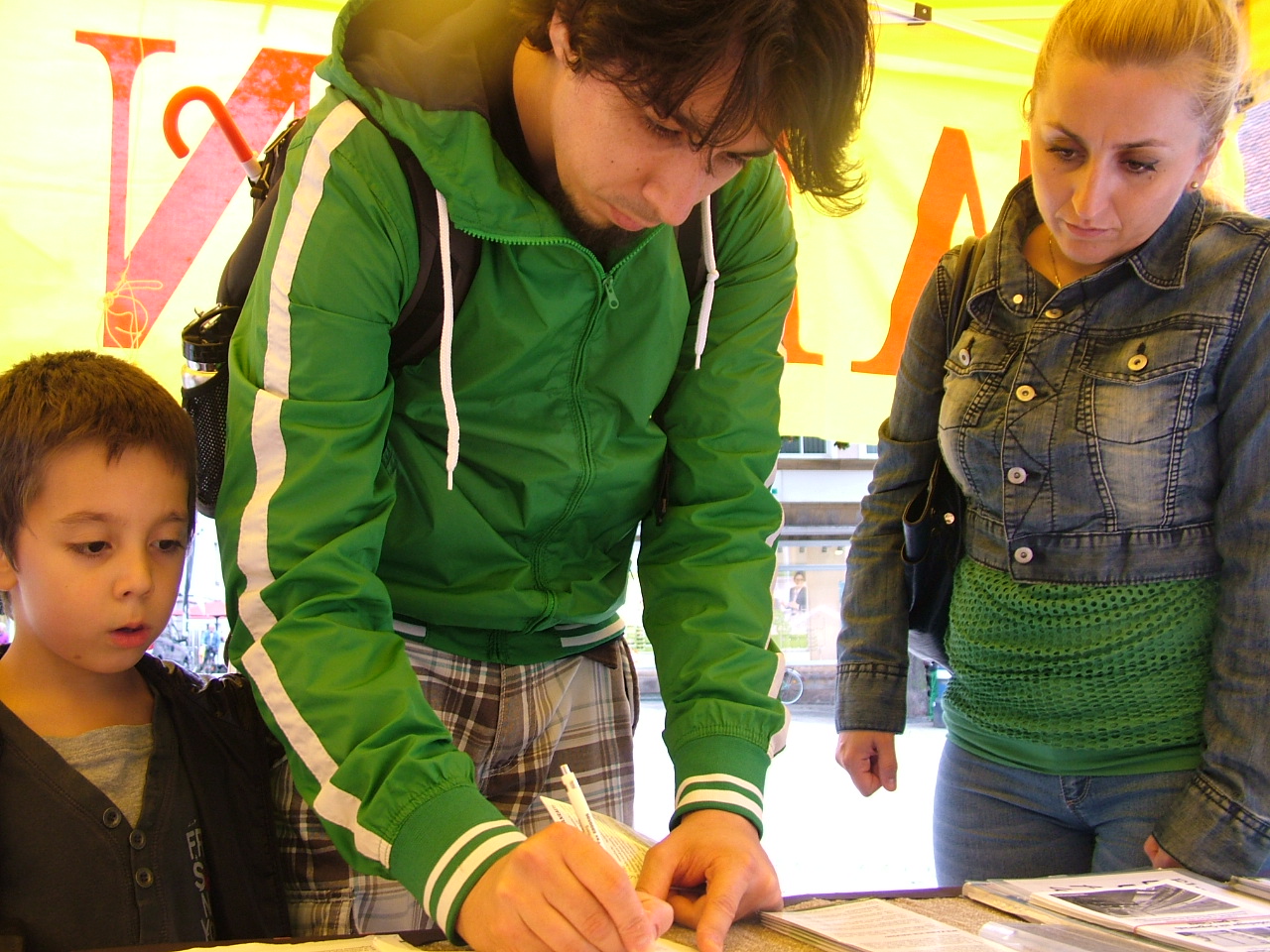 黄色大帐篷四边写着紧急呼吁的集会说明、理念,以及时间的紧迫性、重要性, 很多人看了之后,二话没说,非常严肃的直奔签名簿,签了名就匆匆上班去了。