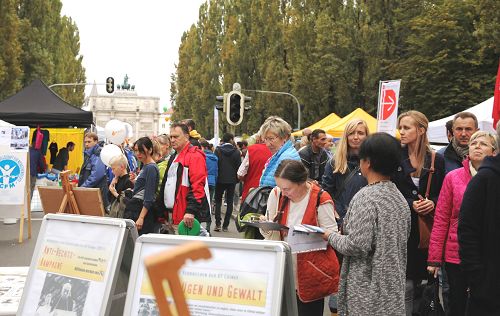 二零一四年九月十三、十四日连续两天,来自德国巴伐利亚州的法轮功学员参加了慕尼黑街头艺术节(Streetlife Corso Leopold)的大型活动,他们搭设了展台,告诉民众法轮功的美好,并揭露中共活体摘取法轮功学员器官的血腥罪行。一些来探亲、学习和工作的大陆华人看到有关信息后,非常专注地阅读展板,听法轮功学员讲真相。他们中的不少人当场表示退出中共的各种组织(退出中共党、团、队,简称三退)。人们做完三退后非常高兴,对法轮功学员表示感谢。
