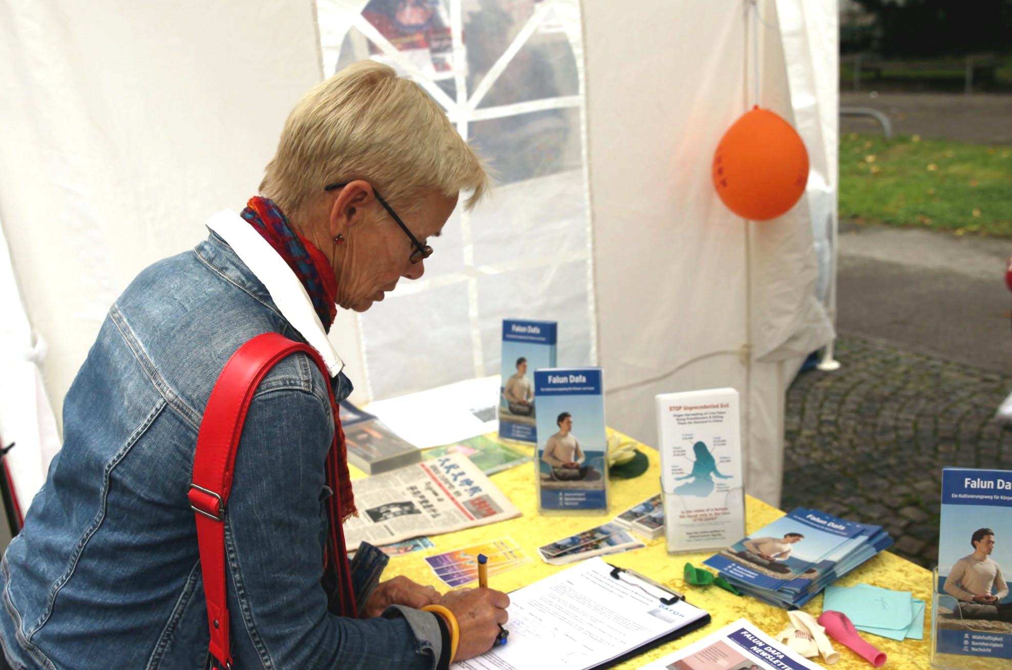 还有一位德国退休白领看到法轮功学员的展台就要求签名,她说自己在马来西亚旅行时,遇到过法轮功学员的信息台,对法轮功受中共迫害有所了解。