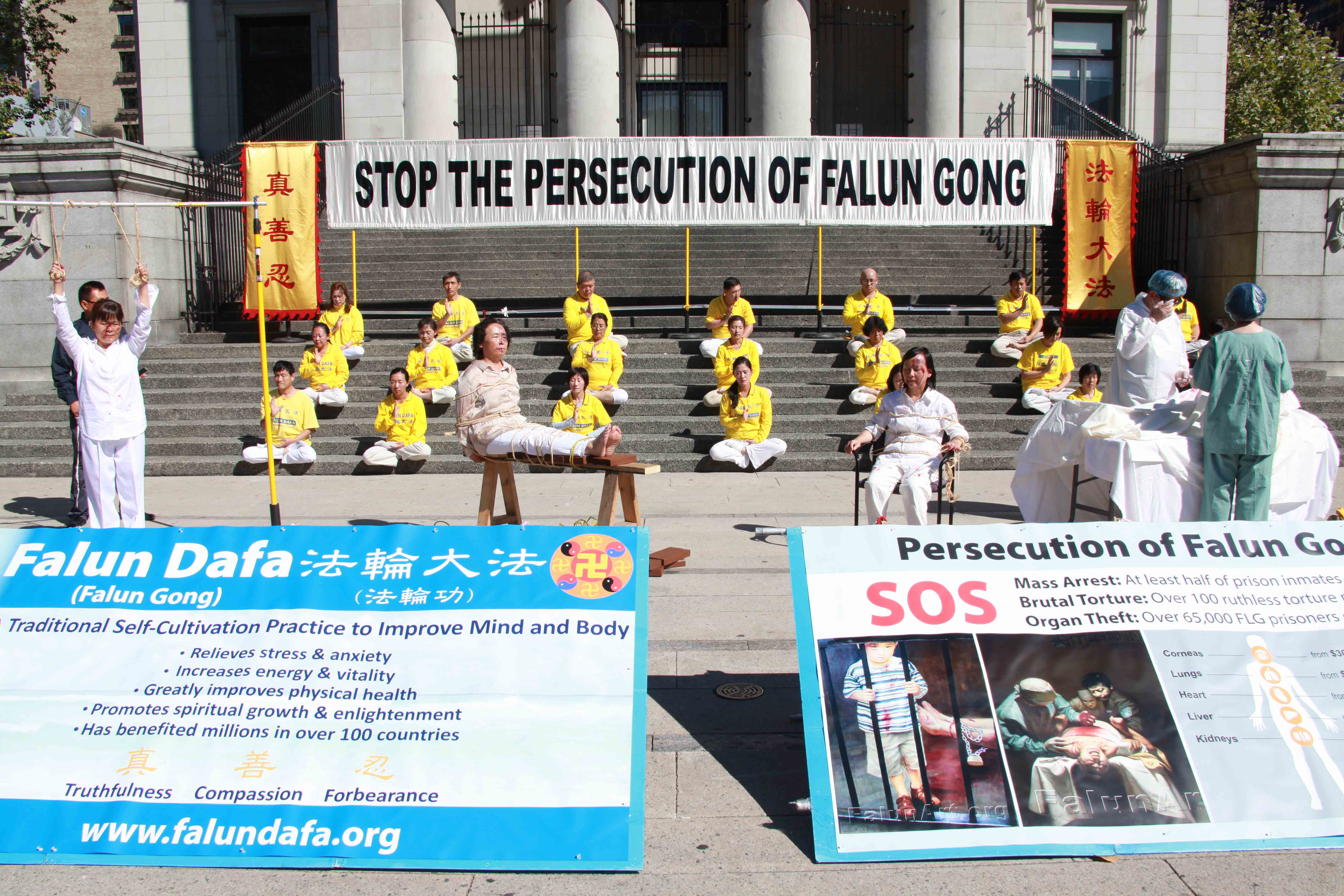 图1-2:温哥华法轮功学员在市中心艺术馆附近举行炼功,模拟酷刑展等反迫害活动