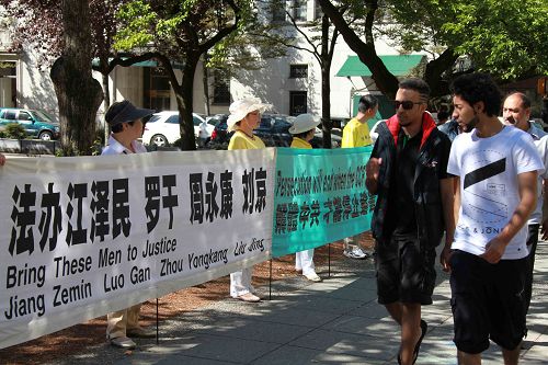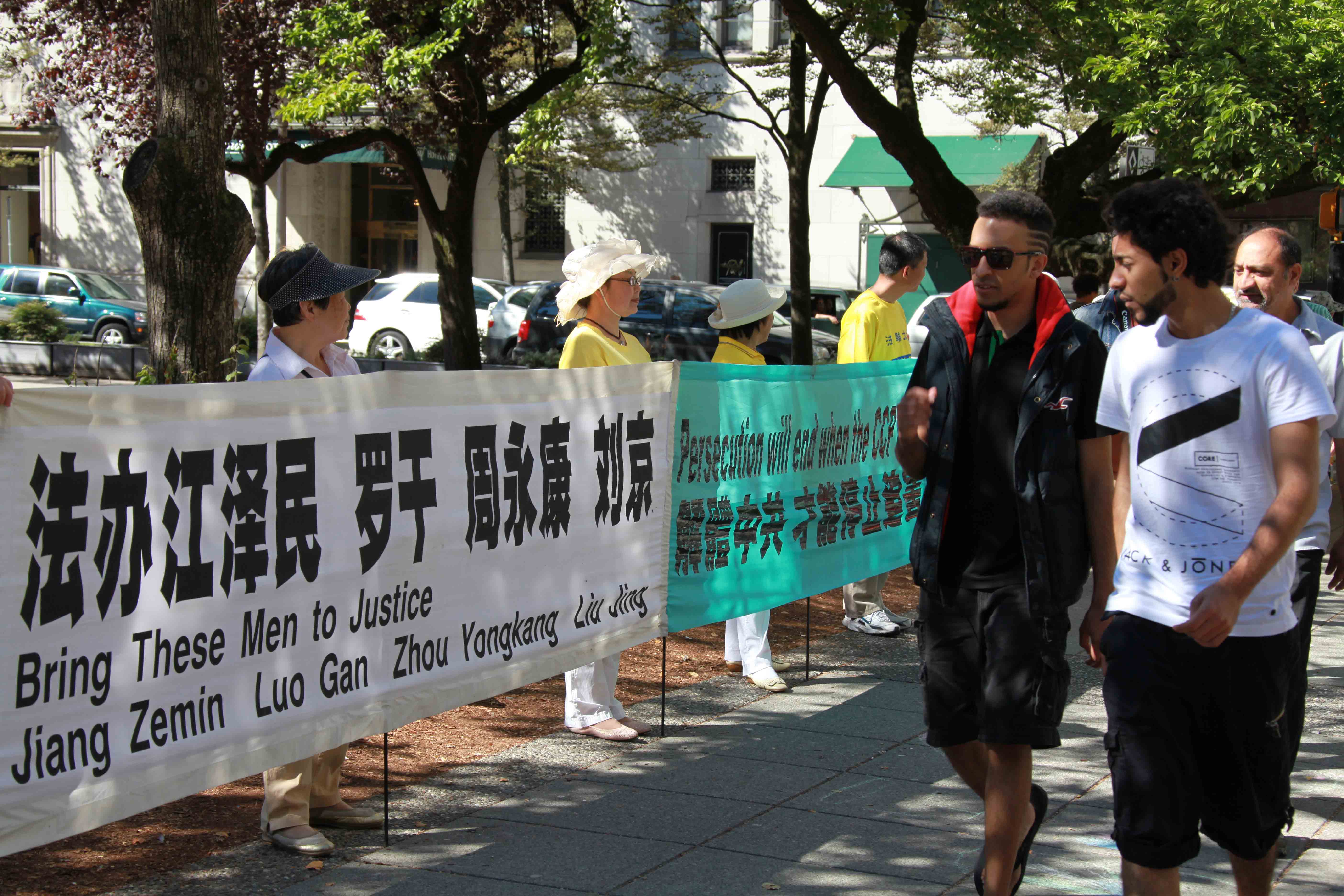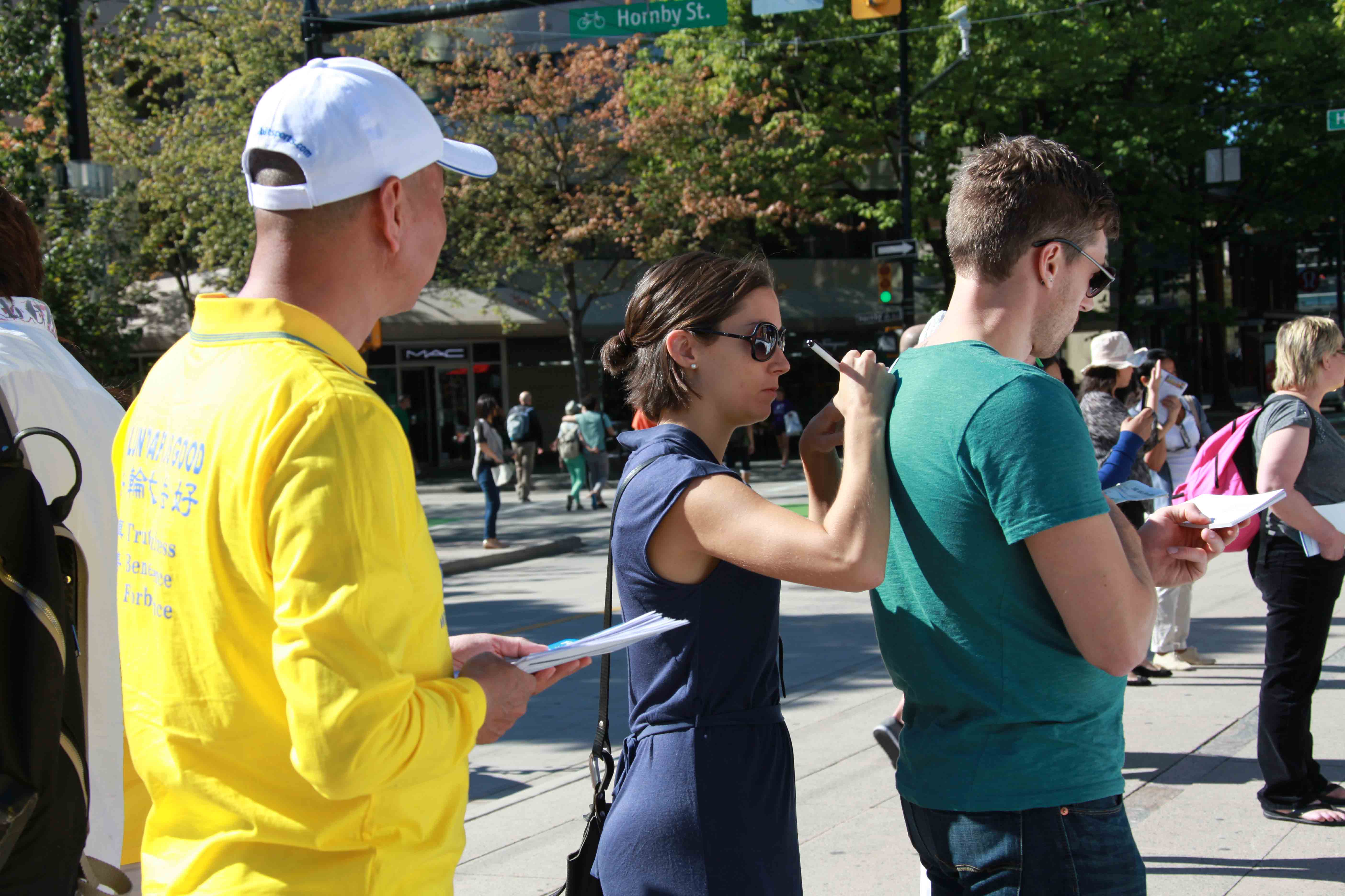 来自北京到加拿大考察的青年刘先生,看到在温哥华市中心法轮功学员,拉开的多幅有关揭露中共迫害等内容的横幅,和加拿大自由平和的社会环境时,他不顾肩上背包的沉重,站在横幅前与法轮功学员聊了很长时间。他表示,在大陆时“翻墙”在海外网站看过国外法轮功学员,在海外广泛传播并得到外国民众支持的消息,今天是亲眼见到了。他感叹,为什么国内国外不一样?!他还详细地询问了法轮功五套功法的习炼等话题,最后他还委託法轮功学员代替他上网声明退出曾加入过的中共党团队组织。
