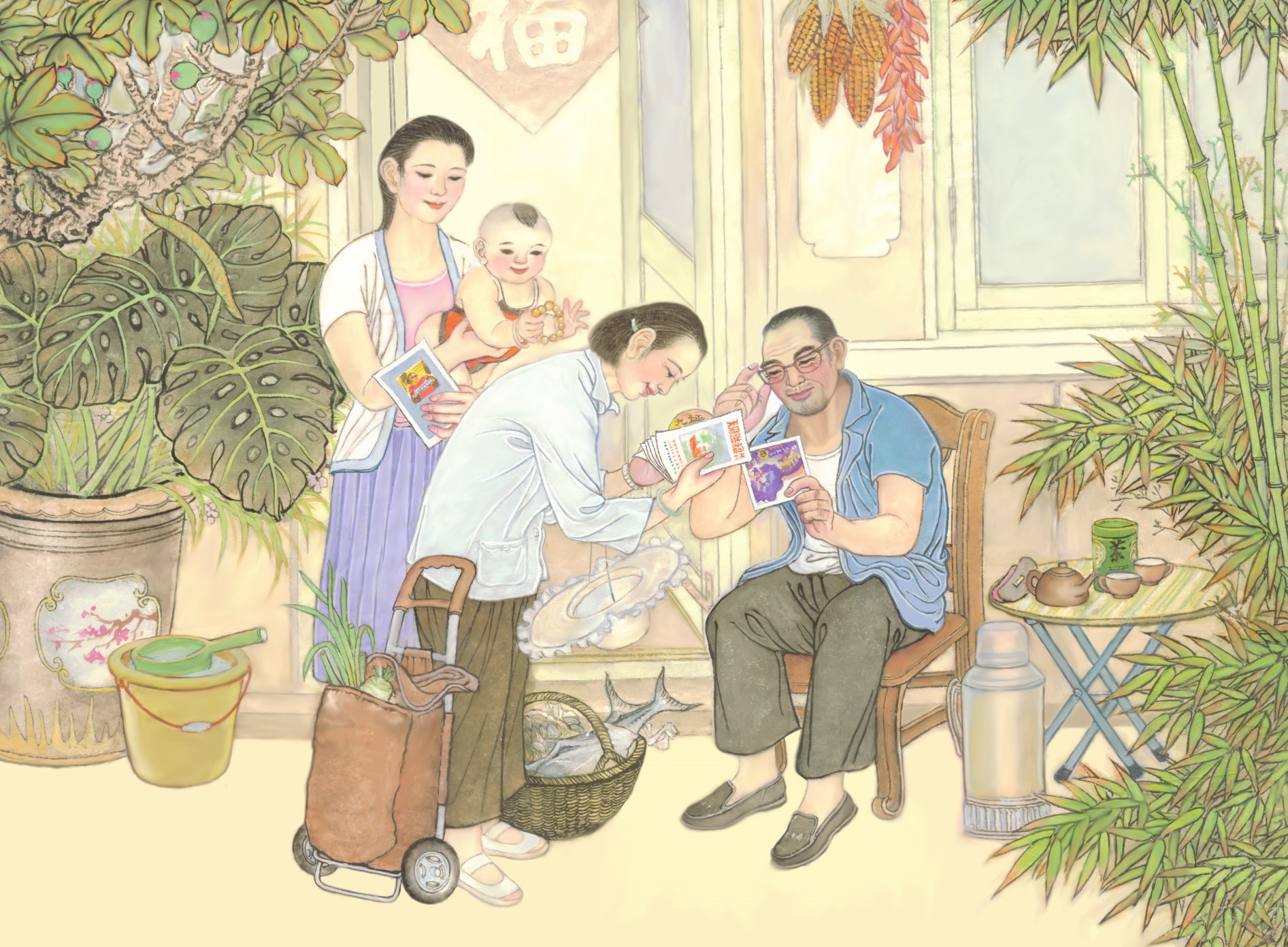 画意:大法弟子在集市洪传真相。世人喜得真相、接洪福归来,全家喜悦。