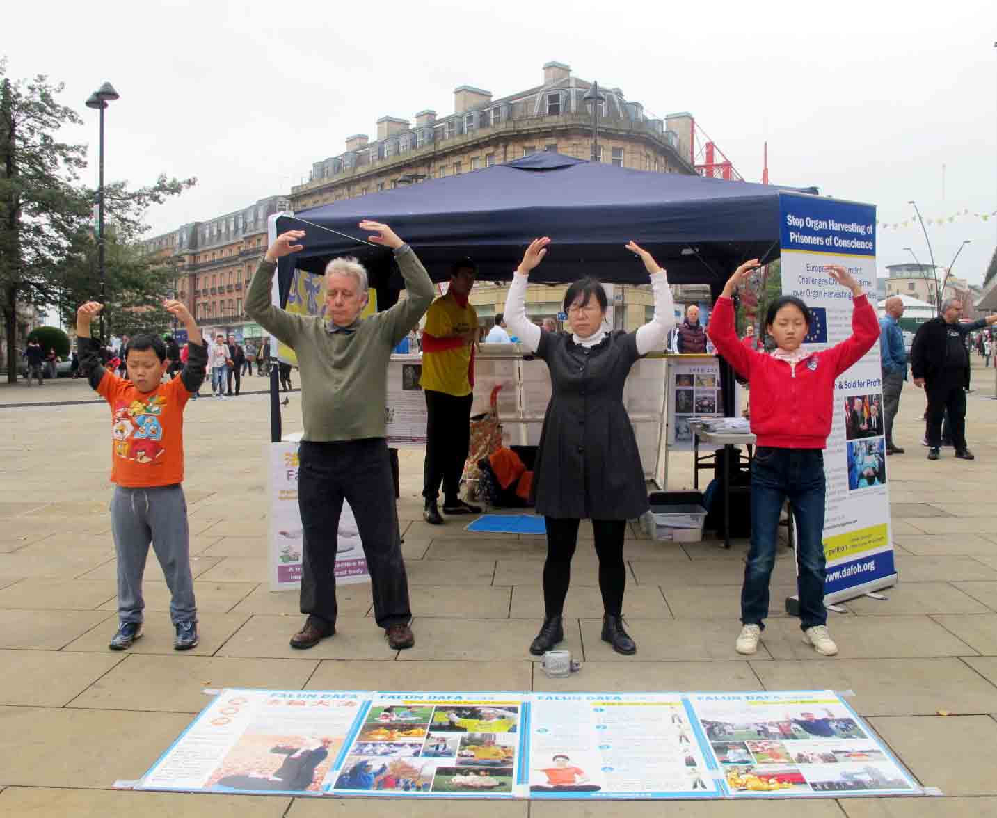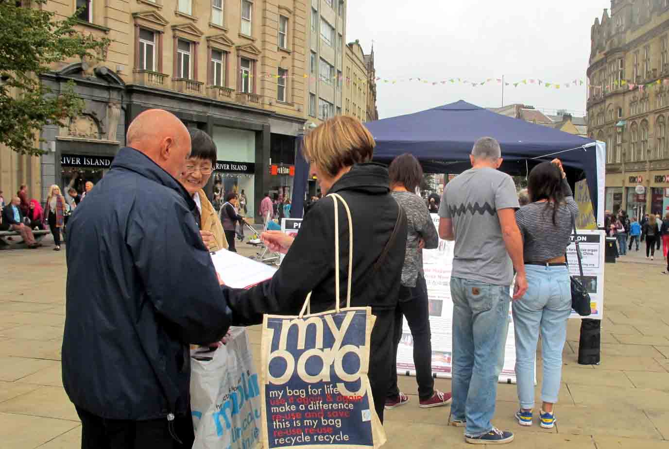 活动从上午十点至下午三点半,学员们演示功法,派发真相资料,并与过路的人们交谈。由于活动地点距离谢菲尔德大学较近,不时能看到中国留学生。当天学员们征集的二百多个反迫害签名和劝退的一百多名中国人中,主要是中国留学生。
