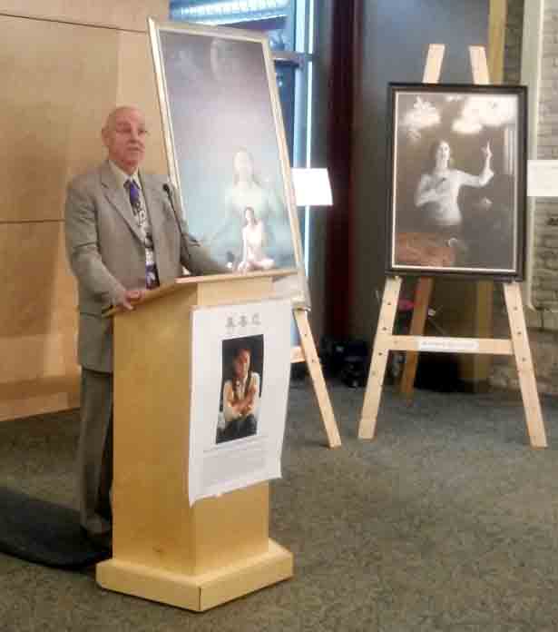 大卫•纽曼代表“和平日”活动主办方和扶轮社感谢法轮功团体和加拿大各界分享和平抗争的经验:“我们感谢类似法轮功群体这样的人,给其他人以力量……法轮功作为捍卫和平的精神战士,在迫害和镇压中保持着真、善、忍。环顾四周,这是我们在这些画作中看到的。这些画体现了和平、美好、勇气和正义,深深打动了我们的心。……感谢各位艺术家,感谢他们的创造力。这次画展是法轮功第二年参加“和平日”活动,我希望这样的合作能持续下去,直到法轮功获得了自由、正义、及和平的那一天。”