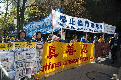 在联合国总部和华尔道夫酒店前,“法轮大法好”、“停止迫害法轮功”、“世界需要真善忍”等多个中英文的大横幅高高竖起,非常醒目。学员们静静地炼功,祥和之场吸引了很多人的注意。