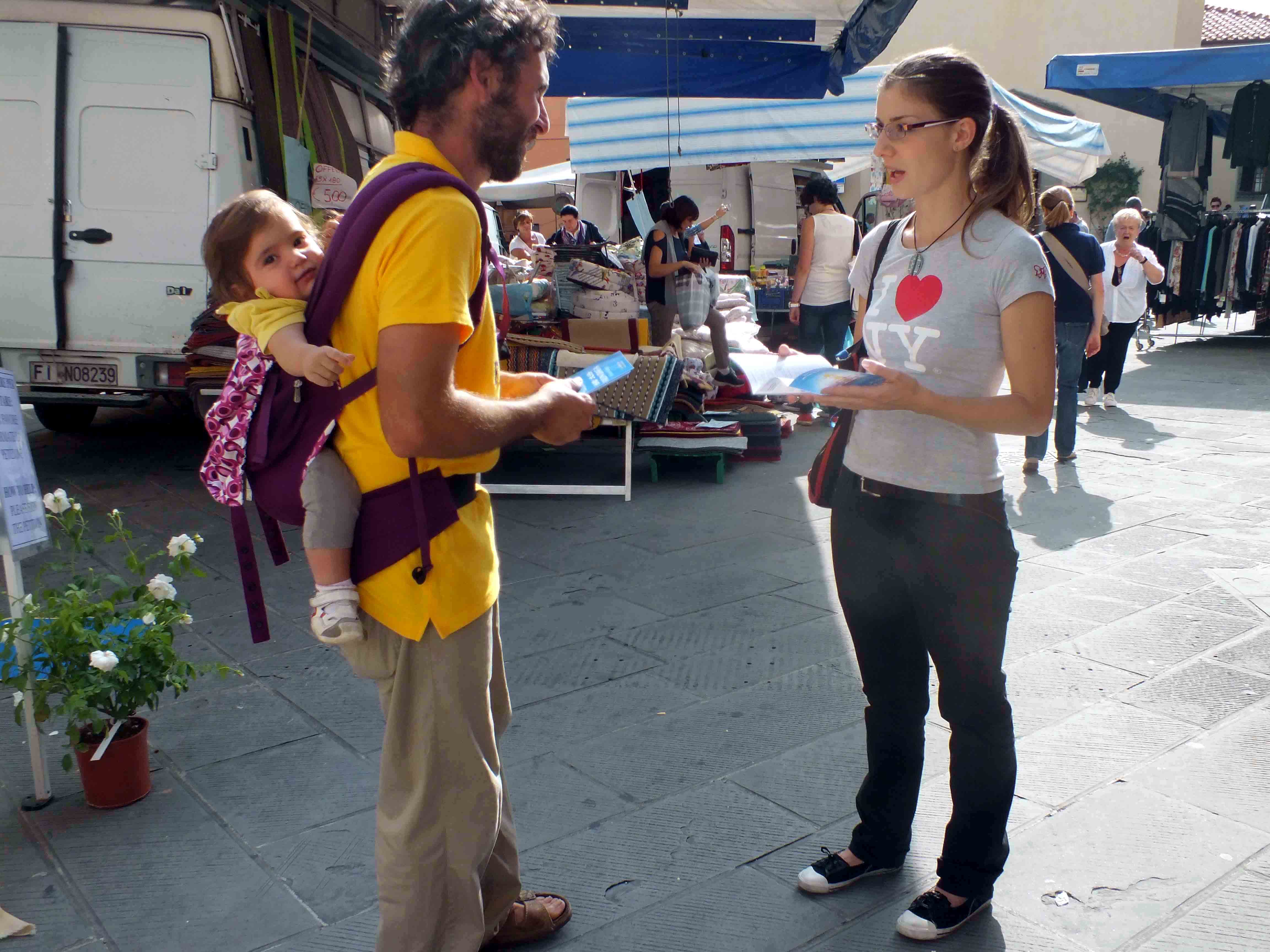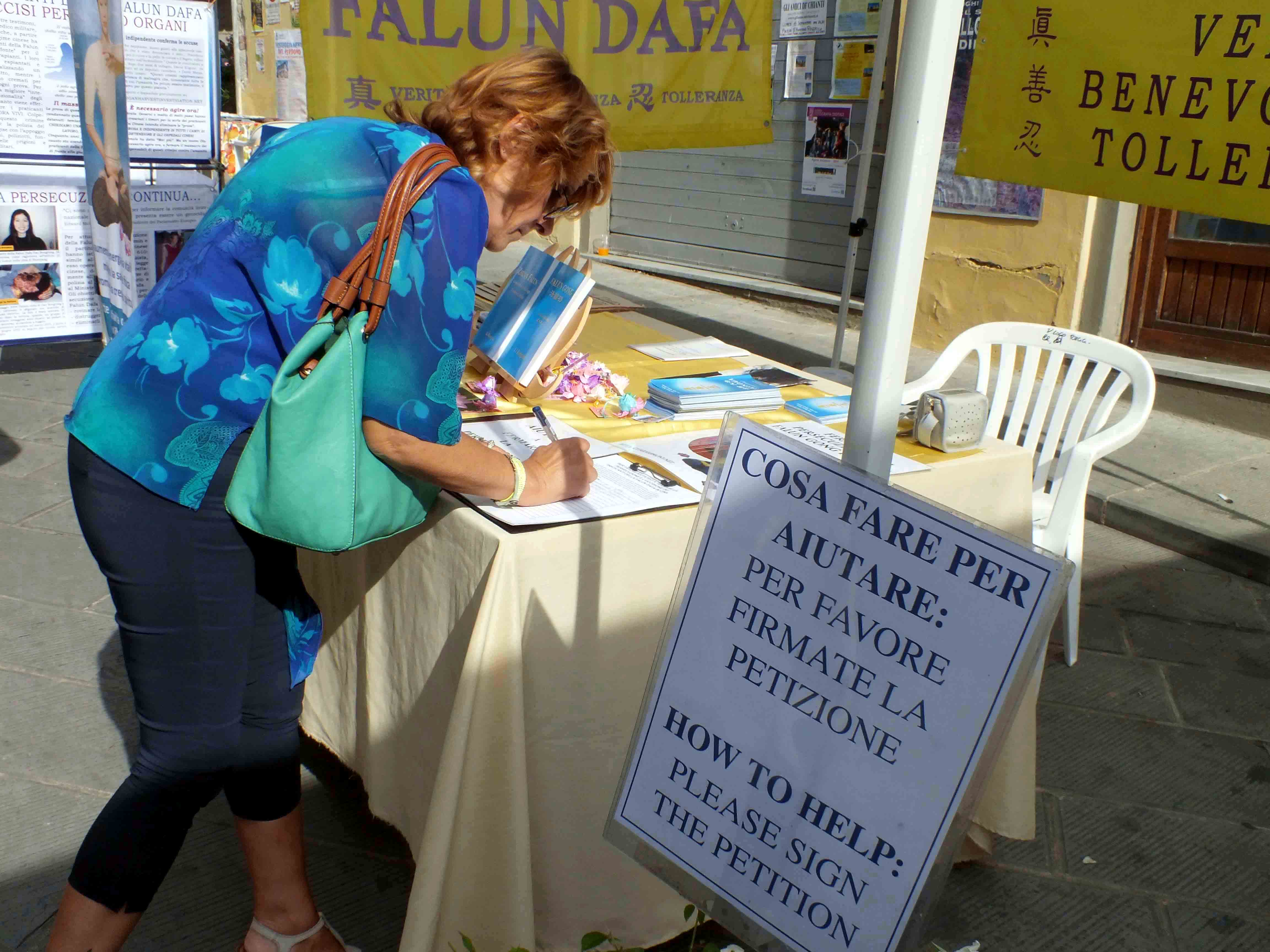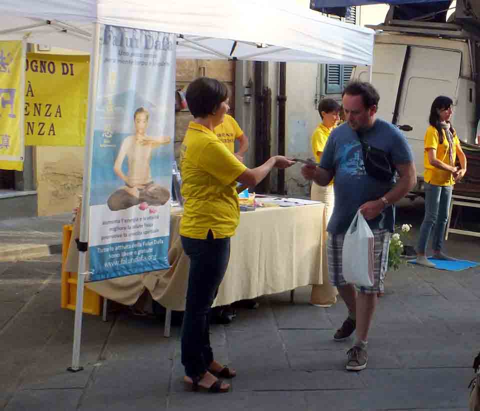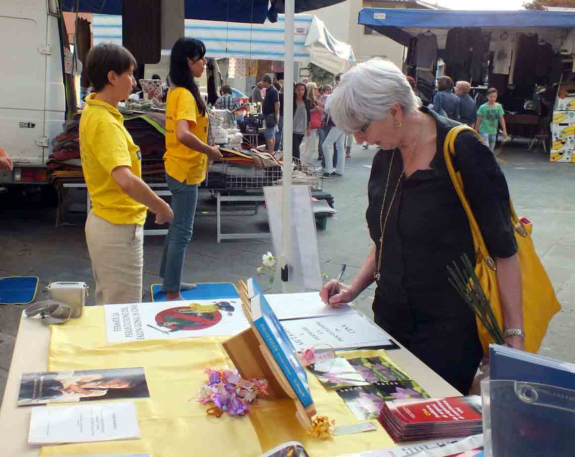 二零一四年九月八日,法轮功学员们来到佛罗伦萨的雷杰洛市(Reggello),在当地的年度展会上讲真相。人们驻足和学员交谈,了解了真相的民众纷纷签名支持法轮功反迫害。