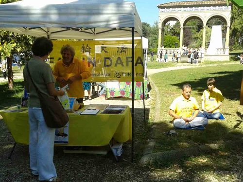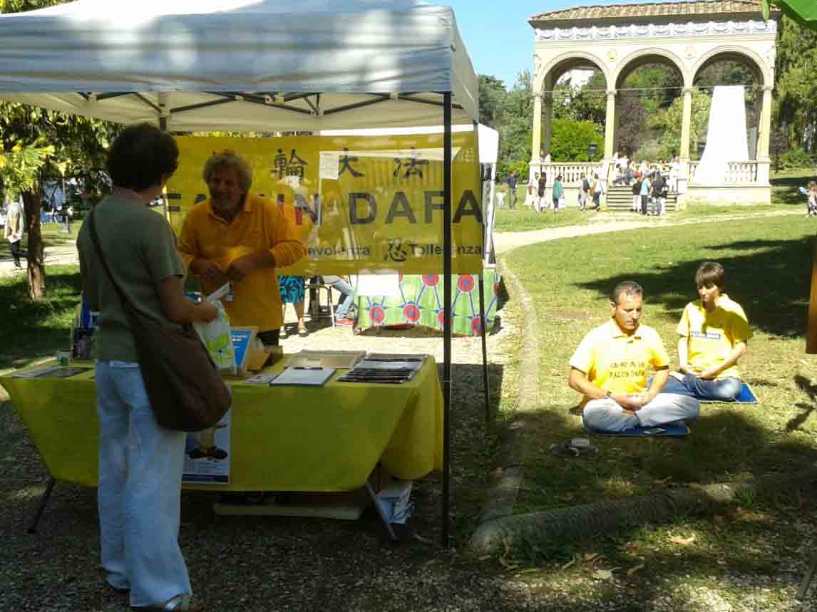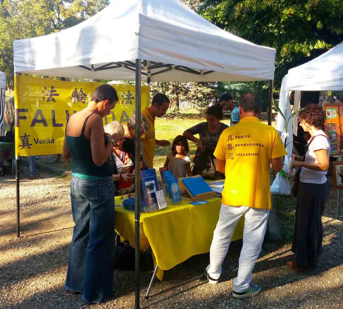 九月七日周日,米兰学员应邀参加了社区举办的一个节日活动。该节日由多个文化协会的志愿者主办。 学员设立了一个信息点,放置真相展板与法轮功真相资料,让人们可以看到在中国大陆中共迫害法轮功的事实图片和信息。从早上开始,法轮功学员不间断的、轮流演示法轮功功法。很多从其它城市来的人都好奇的驻足观看学员炼功,阅读真相展板。因此,学员向人们解释为什么这样一个和平的做法,在中国大陆被残酷迫害十五年。