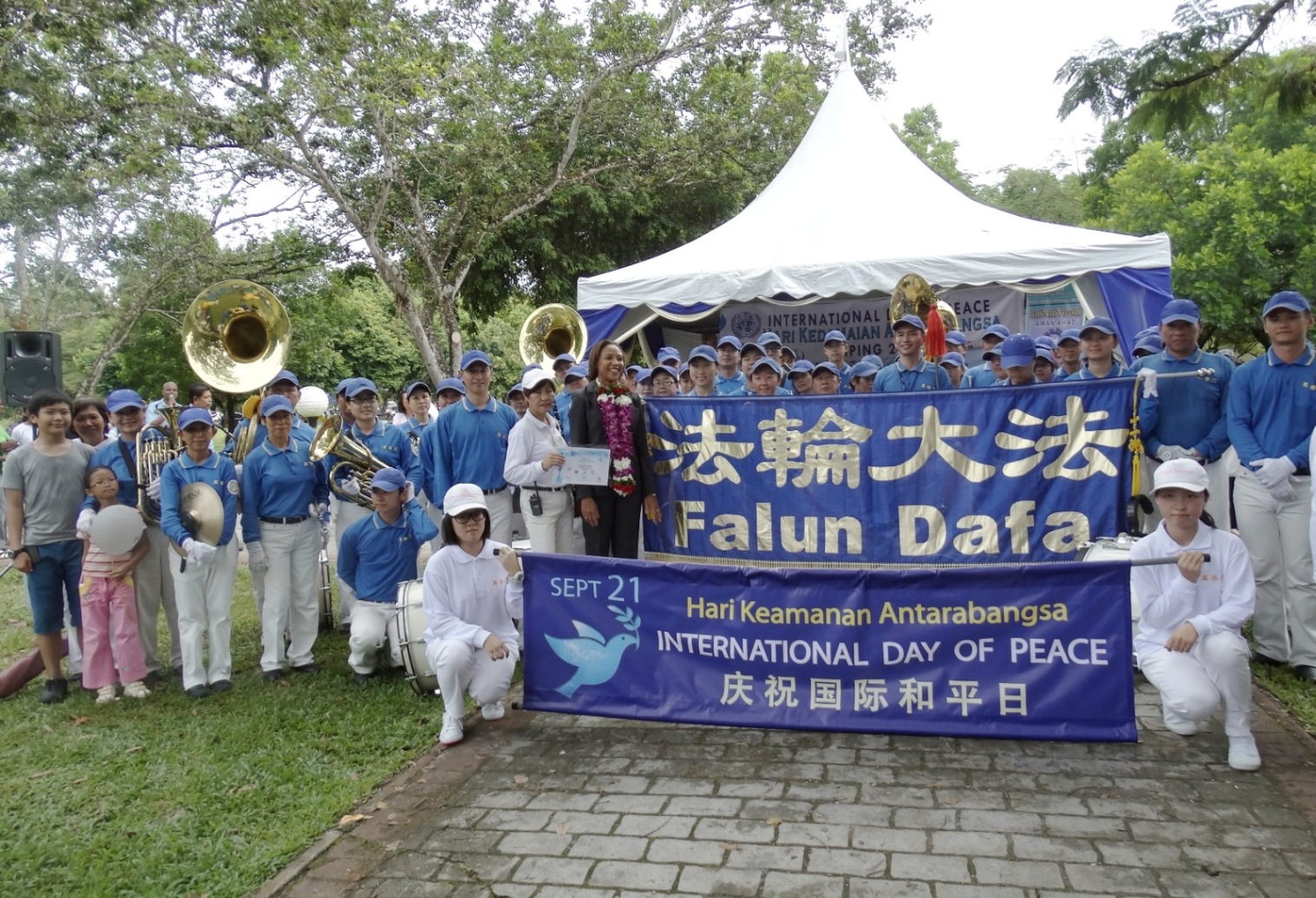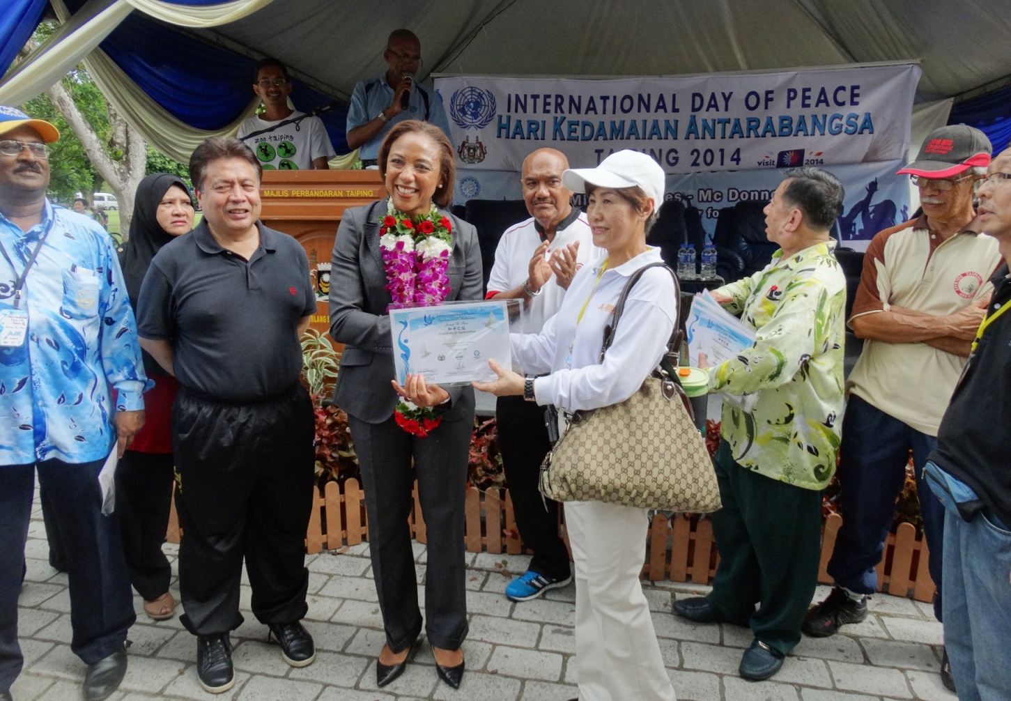 当天,联合国驻马来西亚协调员蜜雪儿(Michelle Gyles-McDonnough,UN Resident Coordinator for Malaysia)也特别出席了在太平举行的国际和平日纪念活动,并为太平每月一次的“和平星期天(Peace Sunday)”的成立主持推荐礼,和颁发感谢状予各参与这次活动的团体。在颁发感谢状仪式中,主持人在介绍法轮大法队伍时给予高度表扬。