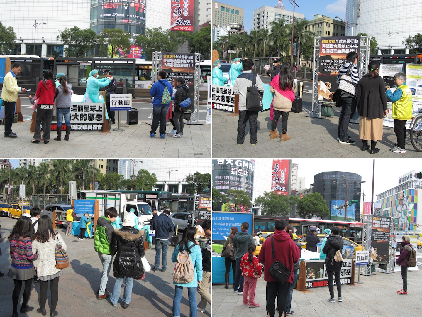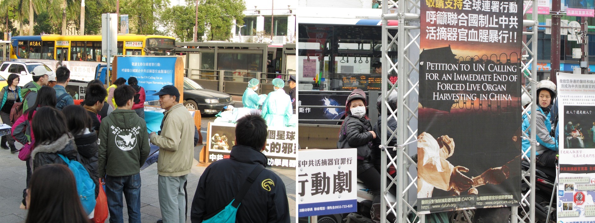![]() 图2-3:“中共活摘法轮功学员器官”模拟演示行动剧吸引车上乘客、摩托车骑士以及熙来攘往的民众聚焦注目。 |