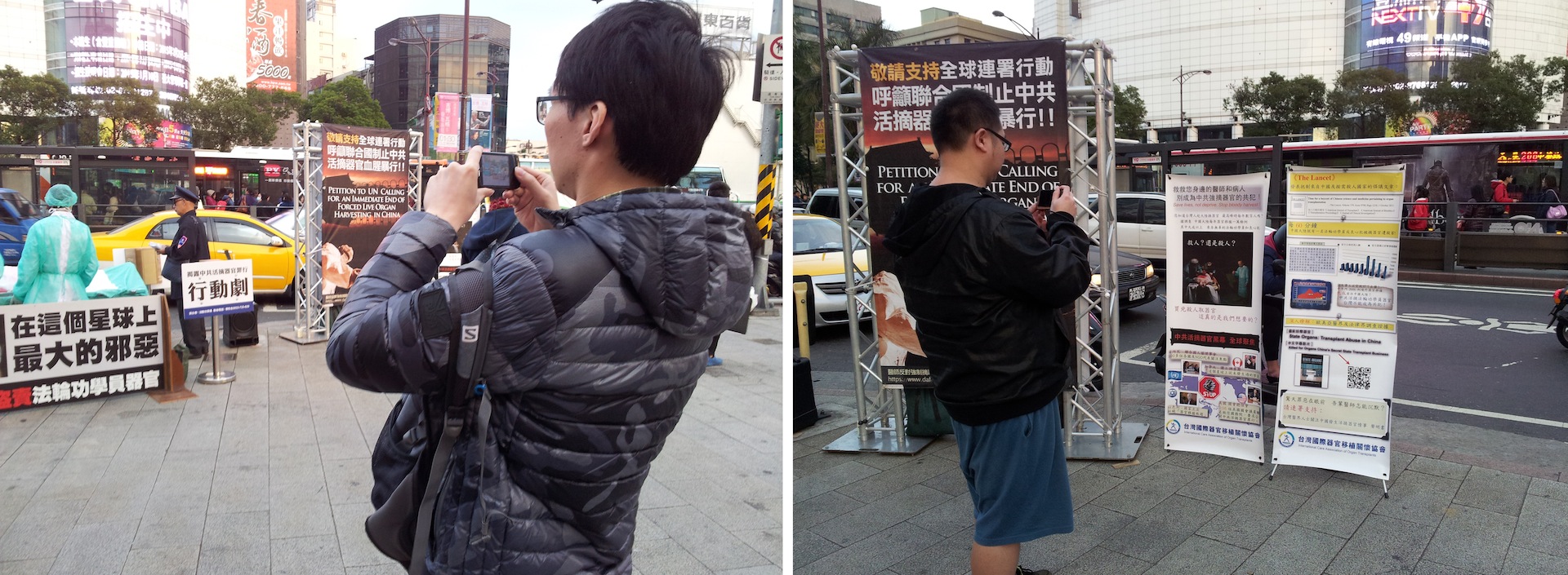 ![]() 图4:在候车亭上的民众也关注“中共活摘法轮功学员器官”模拟演示行动剧,有的还拿起手机拍照。 |