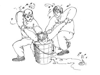 双手反铐,手铐上再拉上铁链子锁在地面木板上。线圈座子直径只有20cm,并故意敲碎上面圆盘,只剩下9cm直径柱芯,逼迫法轮功学员长时间坐着面壁。