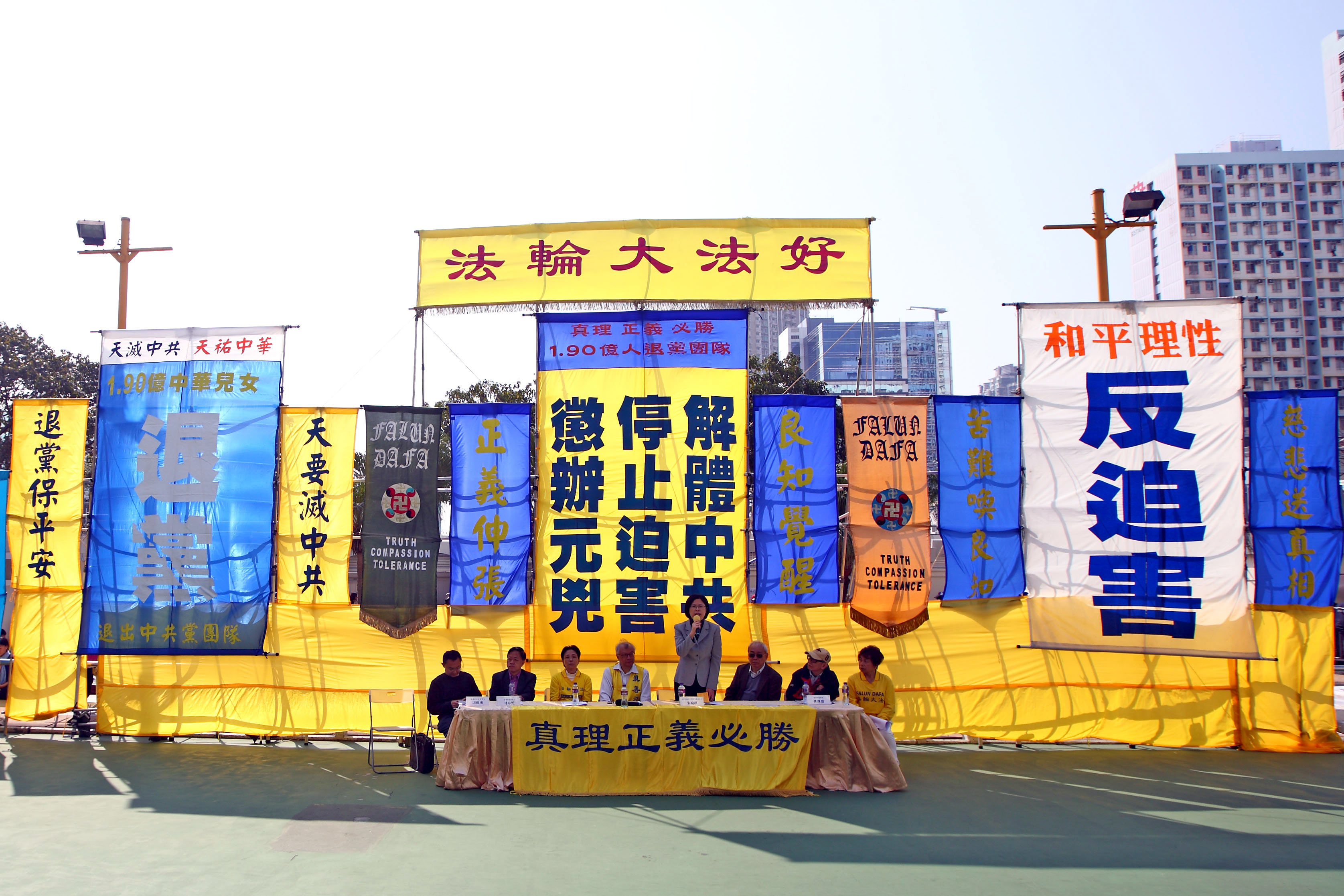 反迫害集会于中午十二时,在九龙长沙湾游乐场举行,多位香港民主派议员到场声援,此外还有多位大陆维权人士和正义之士,透过录音发言方式表达支持法轮功反迫害,他们盛赞法轮功的“真善忍”精神和不屈不挠的坚定意志令人敬佩。