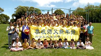 学员中有小弟子从小跟家长学炼大法,唱起《法轮大法好》就特别开心。也有八、九十岁的老婆婆,身体仍非常健朗,跟着年青的学员一起站立二个多小时都不觉得累。也有从大陆来的法轮功学员第一次在海外参加新年活动,当高喊“恭祝师父新年快乐”时,忍不住激动流泪。