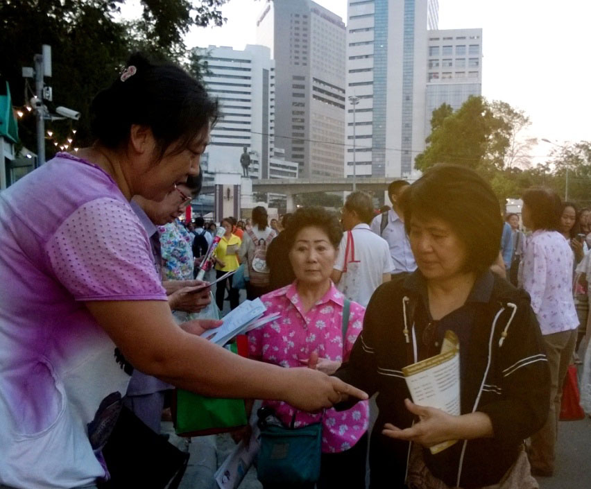 法轮功学员为讲真相而奔忙的身影;民众争相拿取资料的情景;公园亭子里、长椅上、草坪上随处可见静心阅读法轮功真相资料的游人,这成了二零一五年泰国旅游节的一道独特的风景。