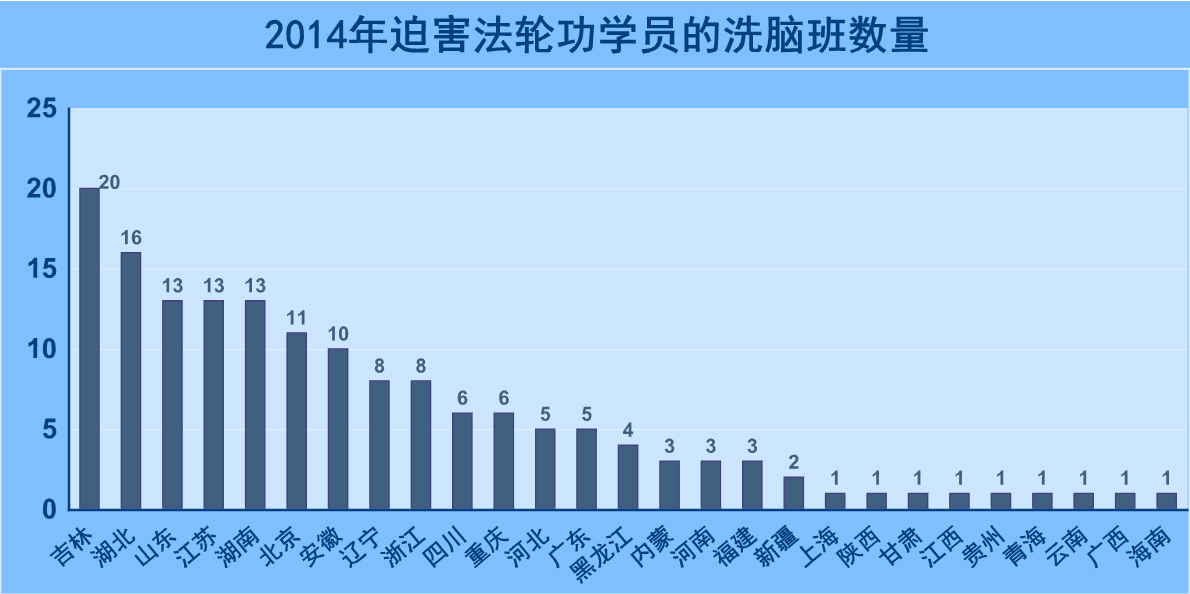 根据明慧网讯息统计,2014年,大陆有27个省、区、市邪党“610”开办“洗脑班”迫害法轮功学员,各类省级、市级、县级、乡镇级和单位洗脑班158个,详见附录。其中:
