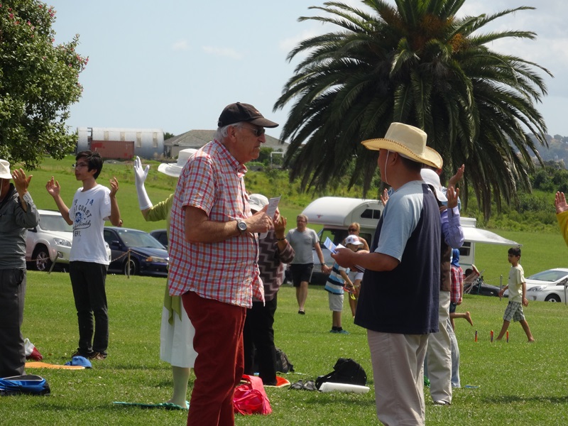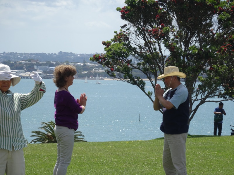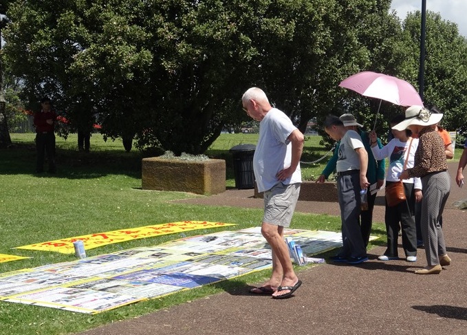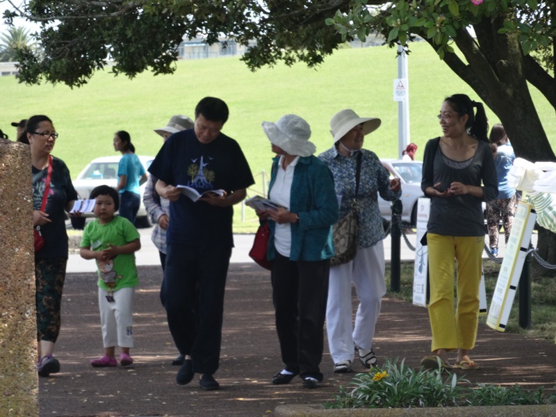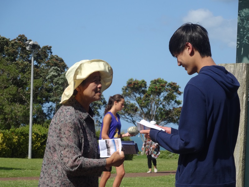 米慎湾真相点也吸引了许多西人游客驻足观看。他们有的很希望了解法轮功的真相;有的询问奥克兰的炼功点地址;有的直接就向在场的法轮功学员学功;还有的自己在旁边学着比划炼功动作,并让朋友为他们和炼功的学员们合影留念。整个场面非常祥和。