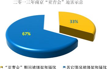 据明慧网信息,二零一三年八月十五日,南京“亚青会”开幕,至少十二名法轮功学员在此前后被南京各地警察、“610”借该名义绑架和骚扰,占全年被迫害总数的三分之一,如下图所示。