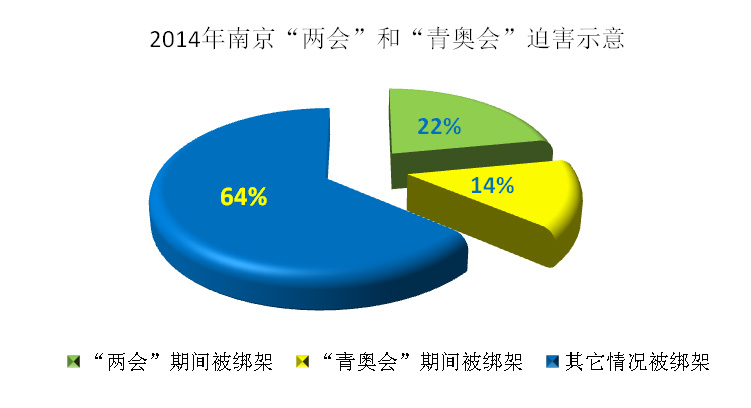 二零一四年三月中共“两会”期间,南京至少十一名法轮功学员被绑架,约占全年被迫害总数的四分之一。