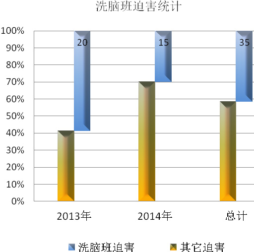 据明慧网信息,二零一三年、二零一四年,两年中,南京地区至少三十五名法轮功学员被从看守所或拘留所转入洗脑班,或被直接劫入洗脑班迫害,约占两年被绑架迫害总数的百分之四十二。其中,二零一三年二十人,约占全年被绑架总数的百分之五十九,一半以上,二零一四年十五人,占全年被绑架总数的百分之三十。如图所示。