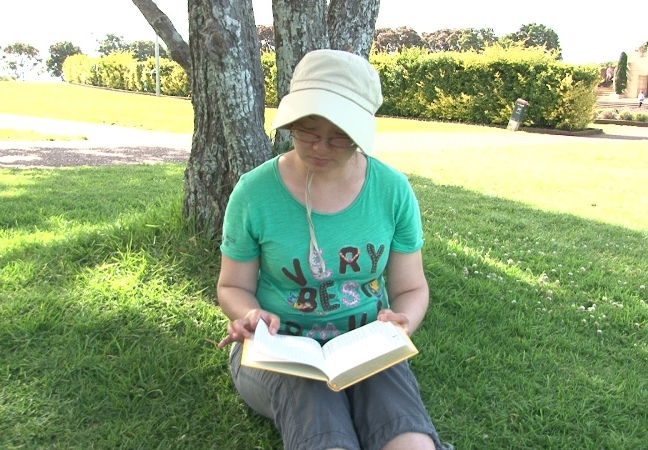 ![]() 尚女士(Helen Shang)在阅读《转法轮》 |