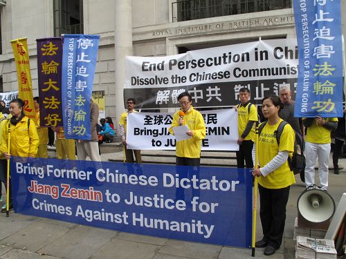 上午十一点二十分新闻发布会开始。英国法轮大法学会主席刘博士、欧洲法轮功之友副主席约翰·迪、曾在中国大陆遭受迫害并已在今年六月向中国高等法院和检察院控告江泽民的法轮功学员宋女士,以及英国法轮功学员尼尔先后在集会上发言。四位发言人希望他们讲真相、呼吁制止迫害的声音,特别是声援诉江大潮的最新信息让中共大使馆的工作人员听到、让即将在十月二十日来访英国的现任国家领导人习近平听到、让更多的广大民众知道,从而推动整个社会正确认识法轮功,共同制止迫害。