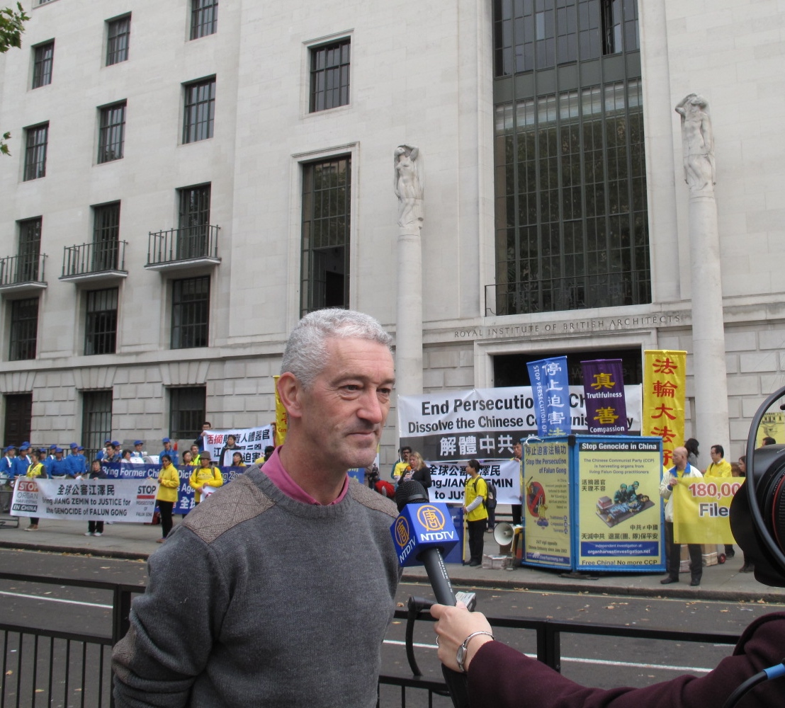 ![]() 图6:二零一五年十月十日,欧洲法轮功之友副主席约翰·迪在中共使馆前的声援诉江集会现场接受媒体采访 |