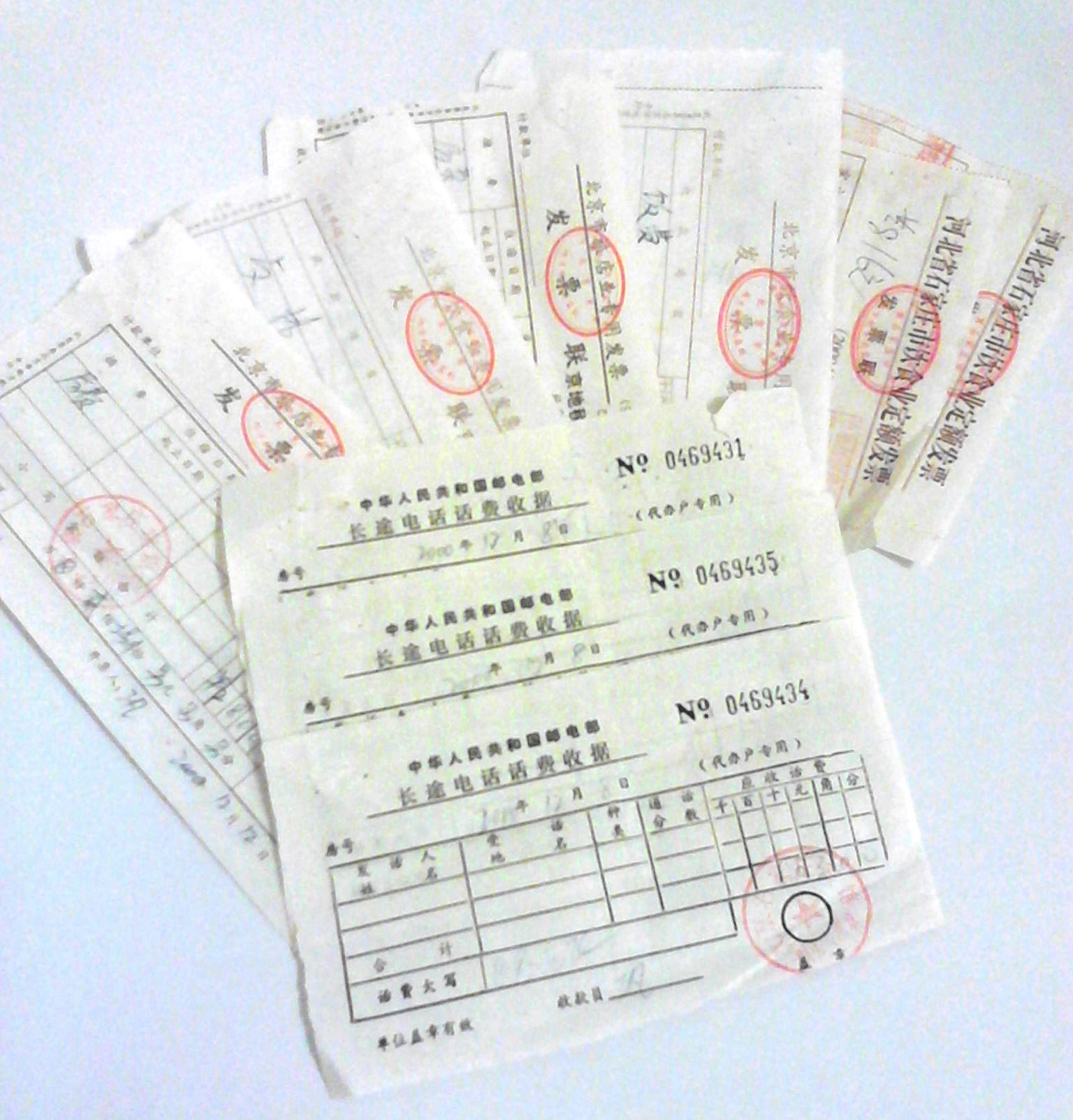 二零零零年十二月,我再次去北京证实法,又被非法抓捕,关押在石市驻京办事处,革新街派出所刘亚章和革新街办事处张国雄来接我。在驻京办事处时,当时警察把我身上所有的钱都搜光,刘亚章问我:“你还炼不炼?”我说:“炼。”刘亚章抡起巴掌狠狠打在我的右耳上,又踹了几脚,我倒在地上,刘亚章大叫起来,当时有百十号人看着,刘亚章把我边推边打,到后院里把我绑在木架上毒打,拳打脚踢了一个多小时。张国雄在旁边看着。我的脸被打的变了形,左眼的白眼球变的象红布一样,眼周围是紫黑色,当时门牙松动了八颗。当天被革新街派出所刘亚章和办事处张国雄押回石家庄。到革新街派出所时,我视力不清,听力受损。张国雄还把他们吃、住及长途电话费的发票,共计八百一十六元(见照片),到我单位报销,这些费用都是从我退休金中扣除的。我当时每月的退休金只有二百五十元,连续扣了我四个月。