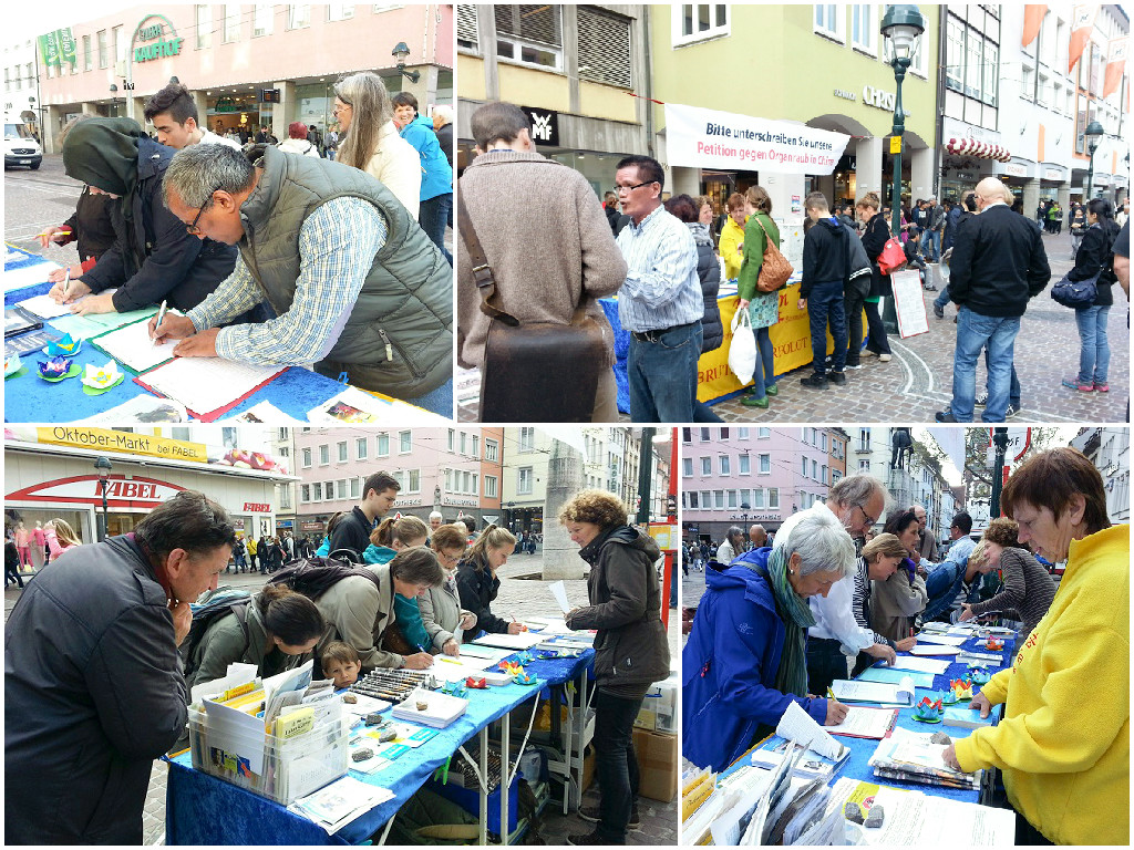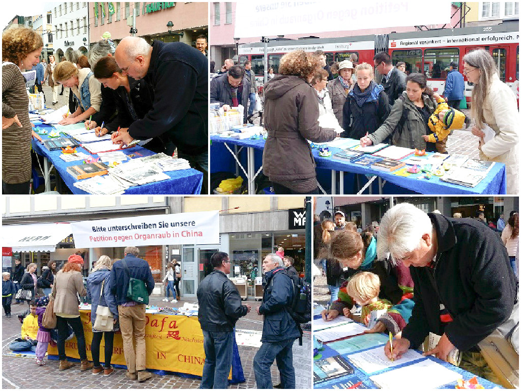 征签台前,有位在本市孔子学院上过中文课的德国女士,建议法轮功学员去弗莱堡大学的教授们那里征签,讲活摘器官的真相,让他们知道中国人权状况恶劣到没有底线的地步。他们明白真相后,应该对中共海外渗透的产物孔子学院施压,对他们有所制约。孔子学院是挂靠在弗莱堡大学下面,经费大概也是弗莱堡大学出。教授挣的钱,办学的钱,都是我们纳税人的钱。他们如果对这样严重的人权迫害闻所未闻,或听之任之,是不可以的,因为他们不为纳税人发声,不代表民意。