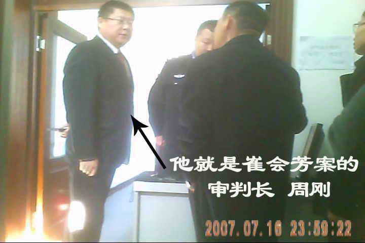 两位律师与法院交涉的过程中,黎雄兵律师发现刑庭庭长、崔会芳案的审判长周刚躲在旁边观察,就喊他出来解决问题,周刚在前一天因不接张科科律师的手续已经与家属、律师有过接触。据家属说,审判长周刚在见到律师和家属时,表现出对崔会芳生杀大权在握,实在令人难以忍受。而崔会芳案的审判员葛莉也悄悄下楼躲到法警屋里观察,他们都穿着开庭的正式服装。两位律师坚决的不配合态度,阻止了原定十月十四日对崔会芳的庭审。