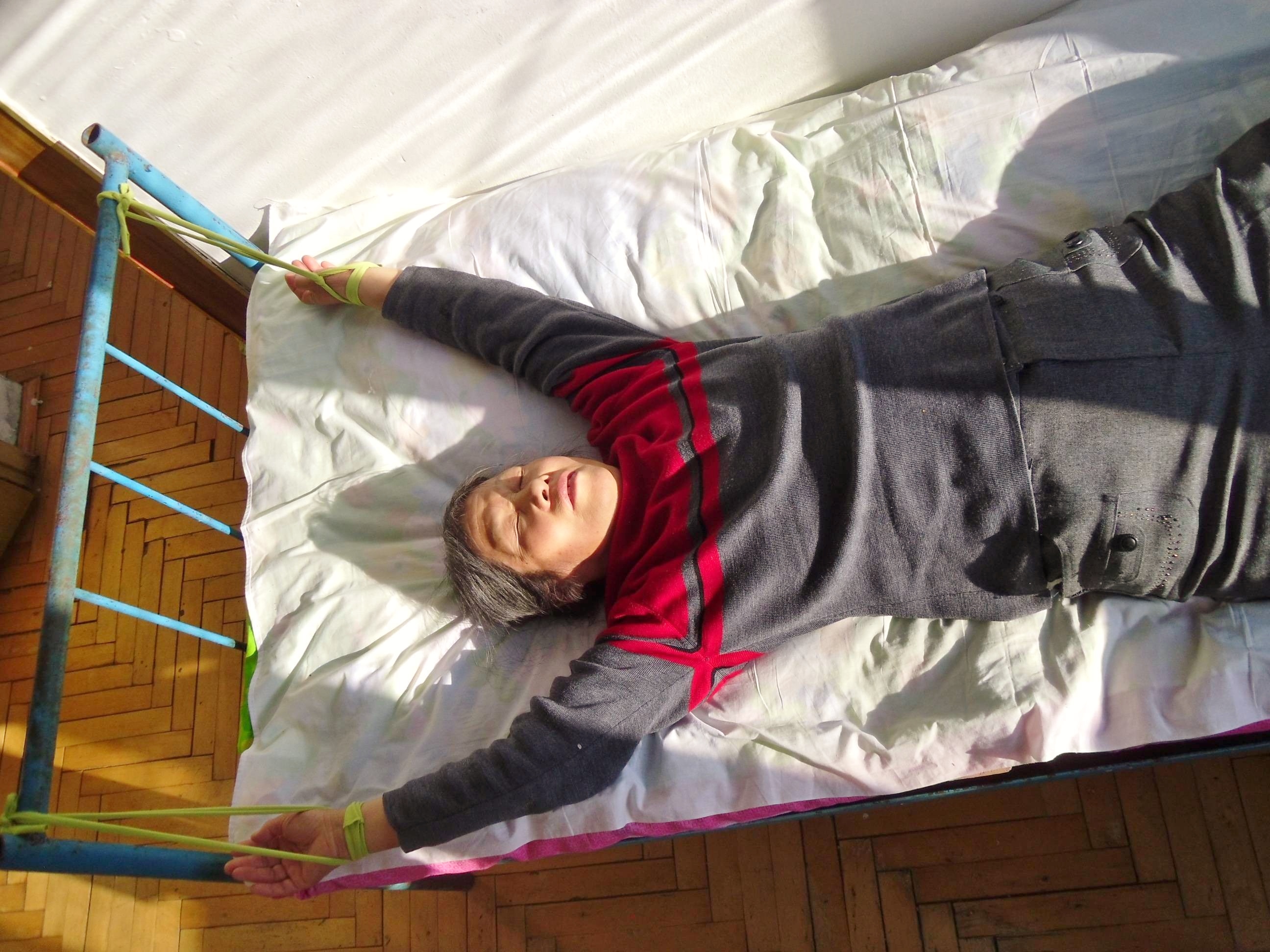 一直到二零零九年八月份,关押在黑龙江省女子监狱的法轮功学员们起来抗议这种酷刑,不准她们再捆绑我,找监狱评理,警察们在压力下,才收回了束缚带。二零零七年八月至二零零九年七月三十一日,长达两年的时间邪恶之徒用束缚带捆绑我,只因为我不放弃信仰,坚持炼功。