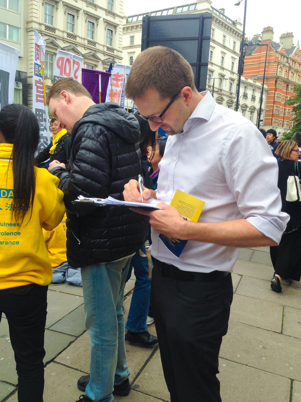 ![]() 图9:二零一五年十月二十二日下午,住在伦敦的电影制片人罗宾(Robin)在谴责中共活摘法轮功学员器官的征签表上签字 |