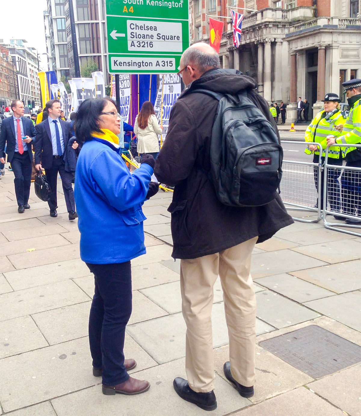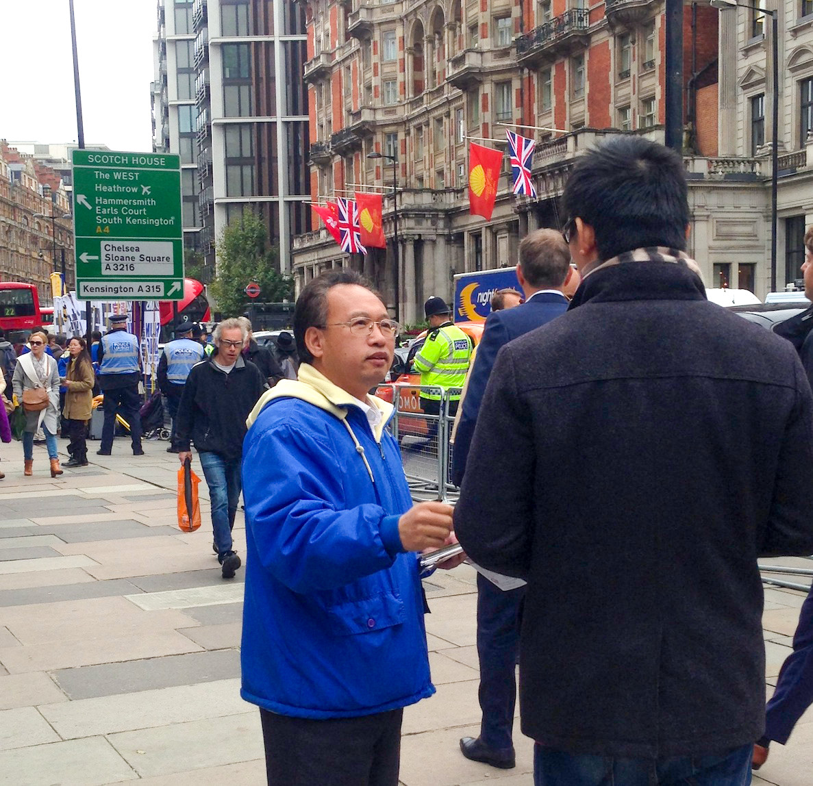 ![]() 图5:二零一五年十月二十二日,在伦敦市中心繁华地带骑士桥(Knightbridge)地区的街头,民众听法轮功学员讲真相 |
