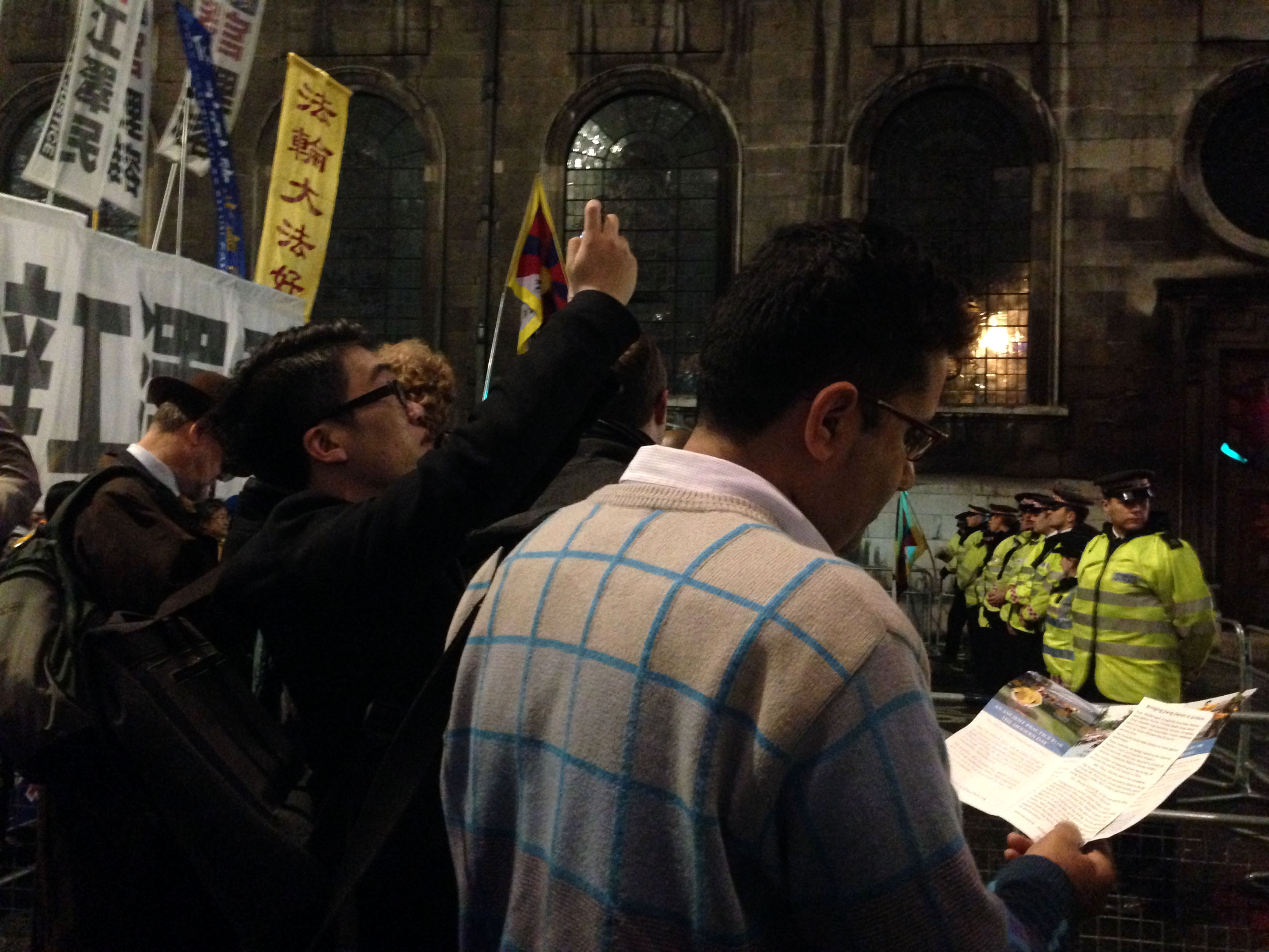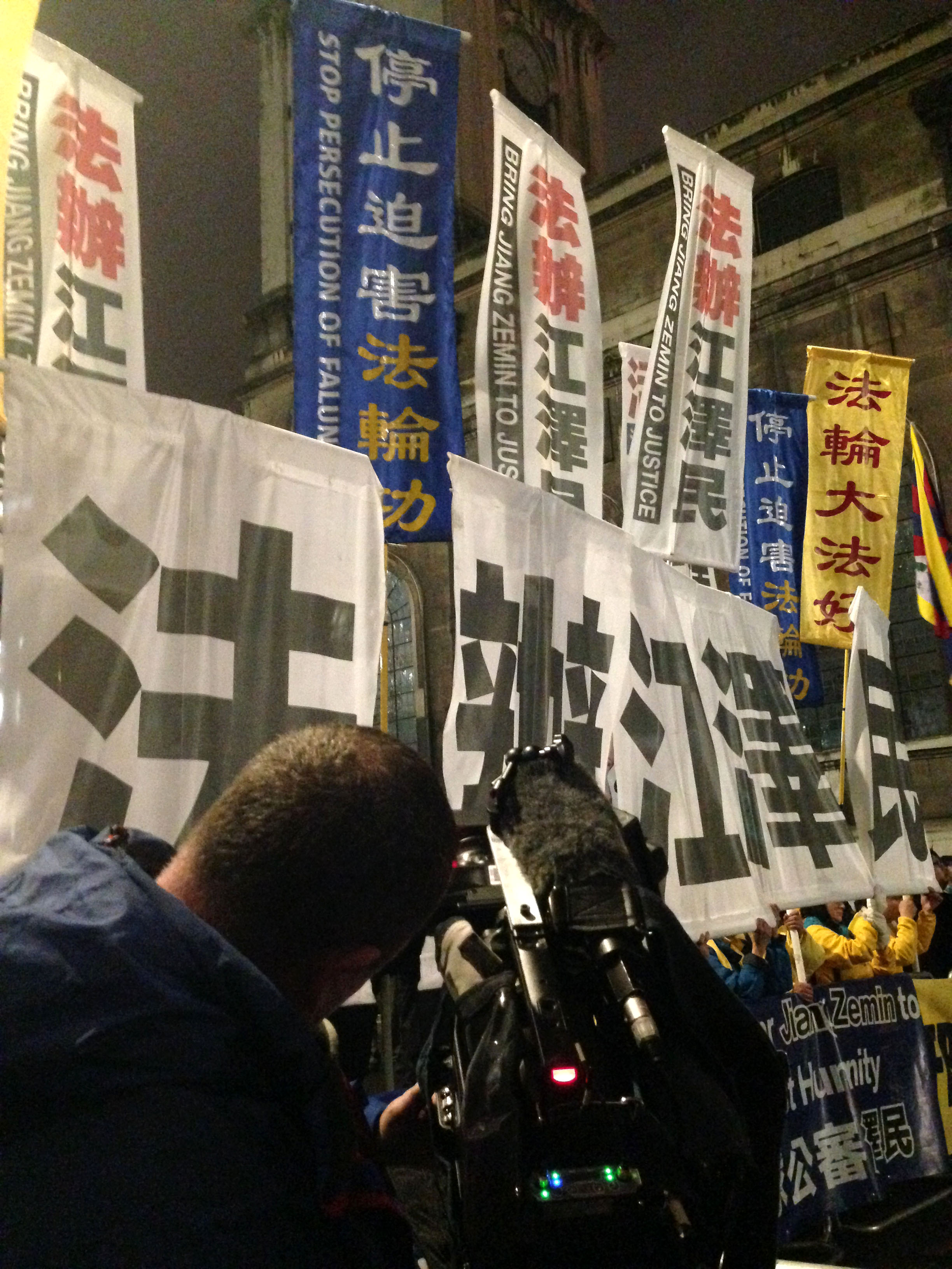 ![]() 图2:二零一五年十月二十一日晚,一家媒体摄像师把镜头对准法轮功学员在伦敦市政厅(Guild Hall)旁打出的真相横幅“法办江泽民” |