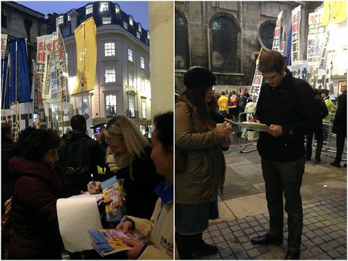 ![]() 图3-4:二零一五年十月二十一日晚,在伦敦市政厅(Guild Hall)旁,很多在伦敦金融城工作的人签字反迫害 |